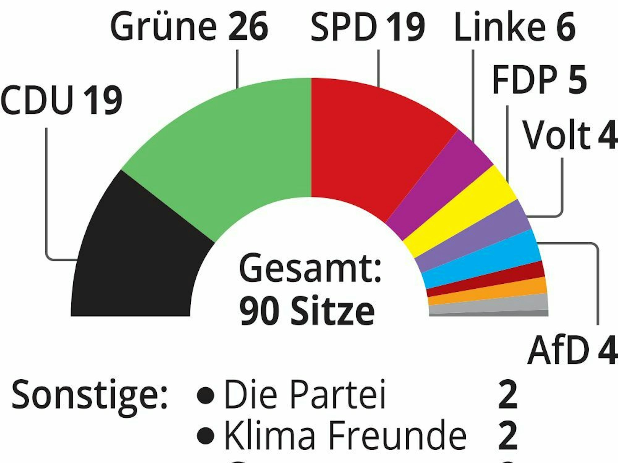 Am Sonntagabend ist klar: Dieser Plan ist aufgegangen, das erleichtert beide Parteien – und macht eine Ausdehnung von Grün-Schwarz zunächst mal möglich und einfacher, weil das Duo mit der Stimme von Reker 46 von 91 Stimmen hat (siehe Grafik). Im alten Stadtrat war das nicht der Fall, seinerzeit waren es nur 44 Stimmen, es brauchte jeweils Partner. Reker gilt als Heftklammer dieser beiden Partner, ohne ihren Wahlsieg wäre es sowohl der grünen als auch der schwarzen Basis schwerer zu verkaufen gewesen, warum dieses Bündnis in den zweiten Satz gehen könnte. Die Grundlage ist nun gelegt, aus ersten losen Gesprächen der vergangenen Woche können ab Dienstag konkrete Verhandlungen werden. Laut Grünen-Parteichef Frank Jablonski werden die Grünen mit allen demokratischen Parteien reden, zunächst mit der CDU. Auf die Frage, ob eine Fortsetzung ein Automatismus sei, sagte er: „Ein Automatismus? Nein.“ Es gehe darum, viele grüne Themen durchzubekommen. Die Grünen dürften ziemlich selbstbewusst agieren angesichts von 26 Sitzen im Rat, Christiane Martin hatte der Rundschau schon gesagt: „Wir werden den Takt vorgeben.“