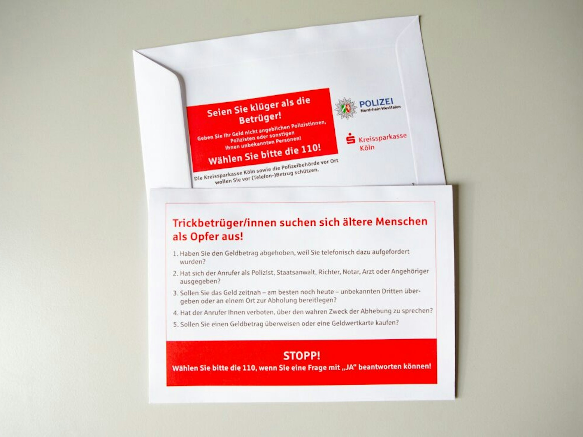 Auf den Umschlägen steht beispielsweise: Haben Sie den Geldbetrag abgehoben, weil Sie telefonisch dazu aufgefordert wurden? Oder: Hat der Anrufer Ihnen verboten über den Zweck der Abhebung zu sprechen? „Unsere Mitarbeitenden in den Filialen sind sehr für das Thema sensibilisiert. So konnten sie bereits zahlreiche Betrugsfälle verhindern, indem sie Kundinnen und Kunden bei auffälligen Auszahlungswünschen gezielt angesprochen haben“, erläutert der Direktor der Kreissparkasse Köln, Wolfgang Eckert.