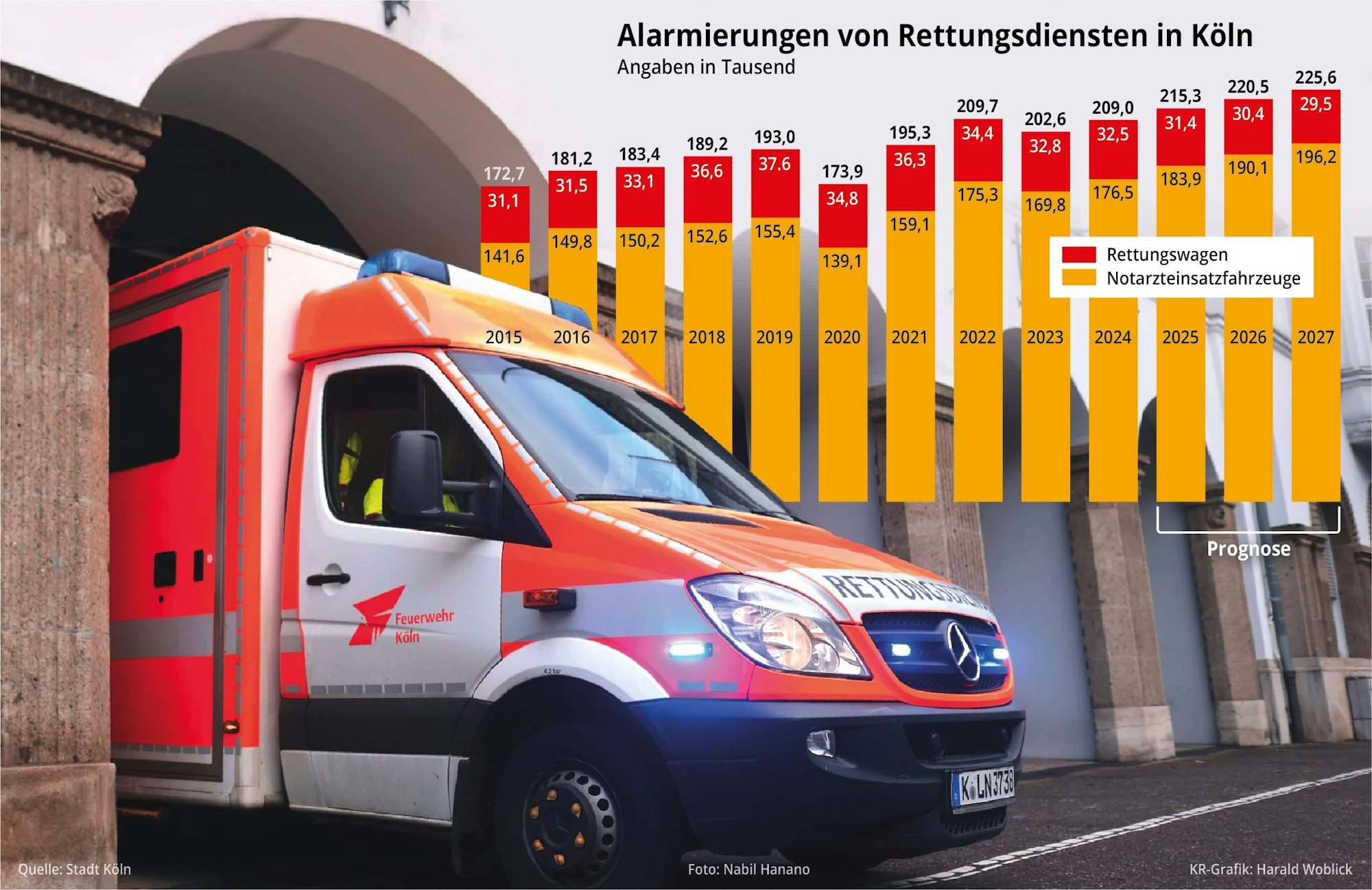 Die Grafik zeigt die Entwicklung der Rettungsdiensteinsätze in Köln seit 2015.