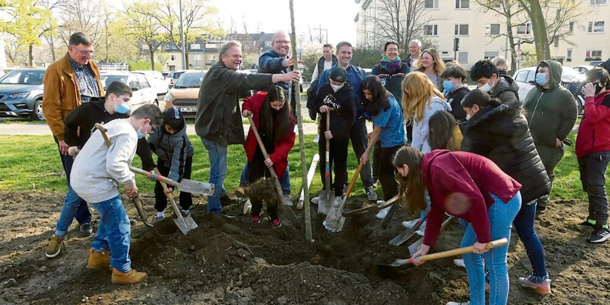 Beim offiziellen Termin zum Start des Wald-Projekts, das im Unterricht der Schule Platz finden wird, aber natürlich auch dem Klima und den Menschen im Viertel zugute kommen soll, halfen Mitarbeiter des städtischen Forstamtes, Bezirksbürgermeister Volker Spelthann sowie Jürgen Hollstein und Jochen Ott von der Schutzgemeinschaft Deutscher Wald, die das Projekt fachlich begleitet. Schulleiterin Katja Bouzols unterstrich, wie gut das Projekt an ihrer Schule aufgehoben ist: „Inklusion, Berufsvorbereitung, aber auch die Arbeit an der frischen Luft, wo man sich ruhig mal die Hände schmutzig machen darf, sind wichtige Bestandteile in unserem Schulprogramm“, sagte die Rektorin.
