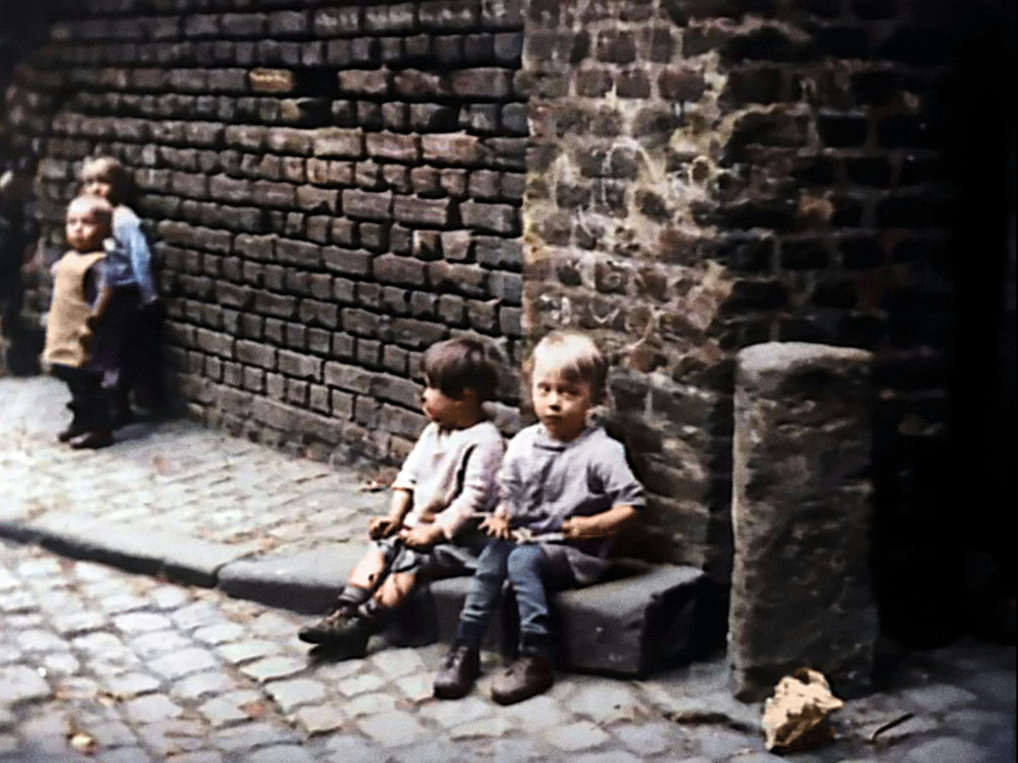 Kölner Kinder in einem Hinterhof am Eigelstein, 1920. Szene aus dem Film „Das alte Köln in Farbe für Kinder“ von Hermann Rheindorf.