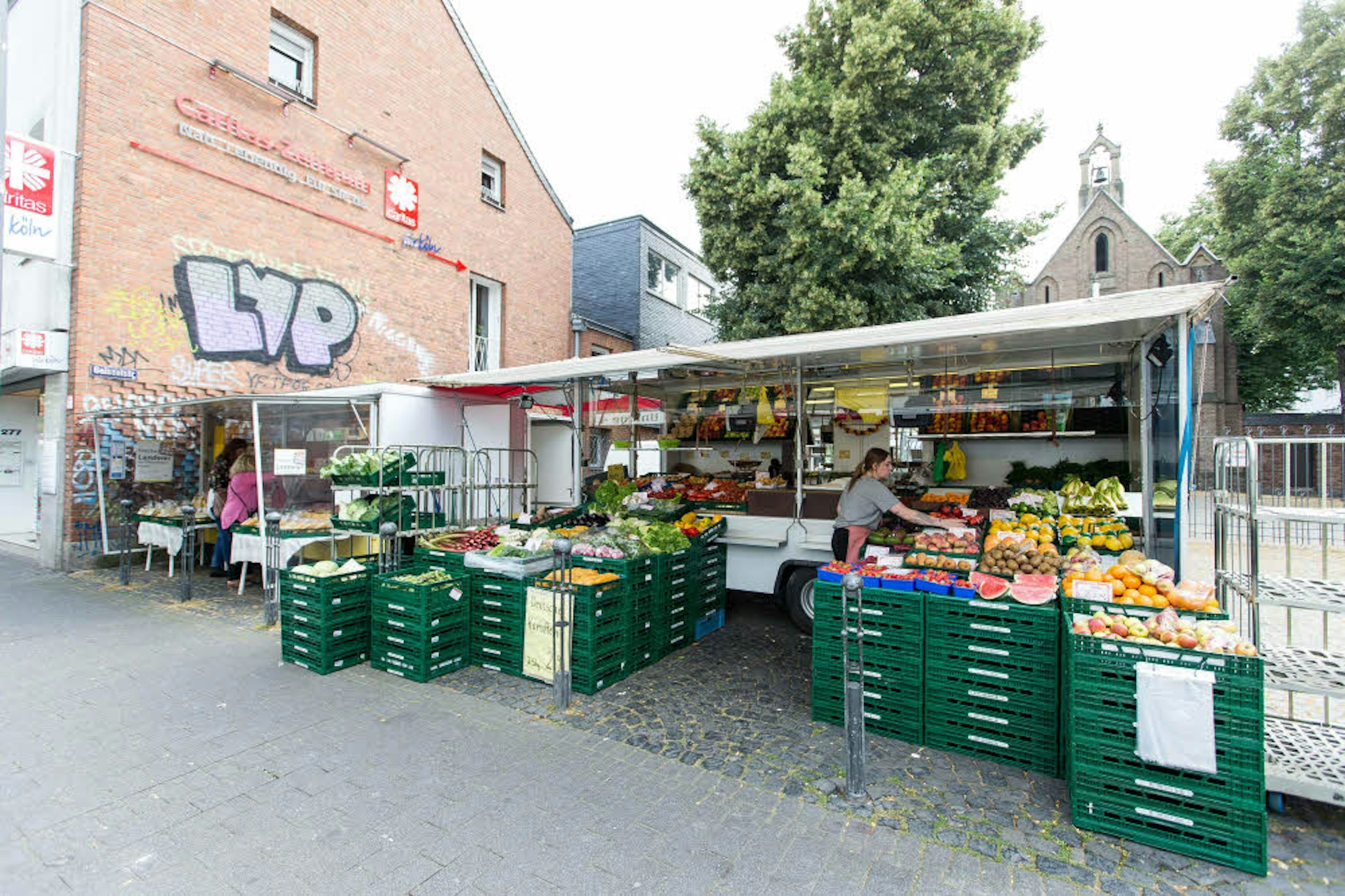 Zu den ältesten Händlern gehört der Eier- und Gemüsestand am Geisselplatz, vis-a-vis Traditions-Adressen wie Haus Scholzen. „Wir sind hier seit 52 Jahren, zwischendurch war’s mal schlimm, mittlerweile ist es wieder besser“, sagt die Stand-Inhaberin.