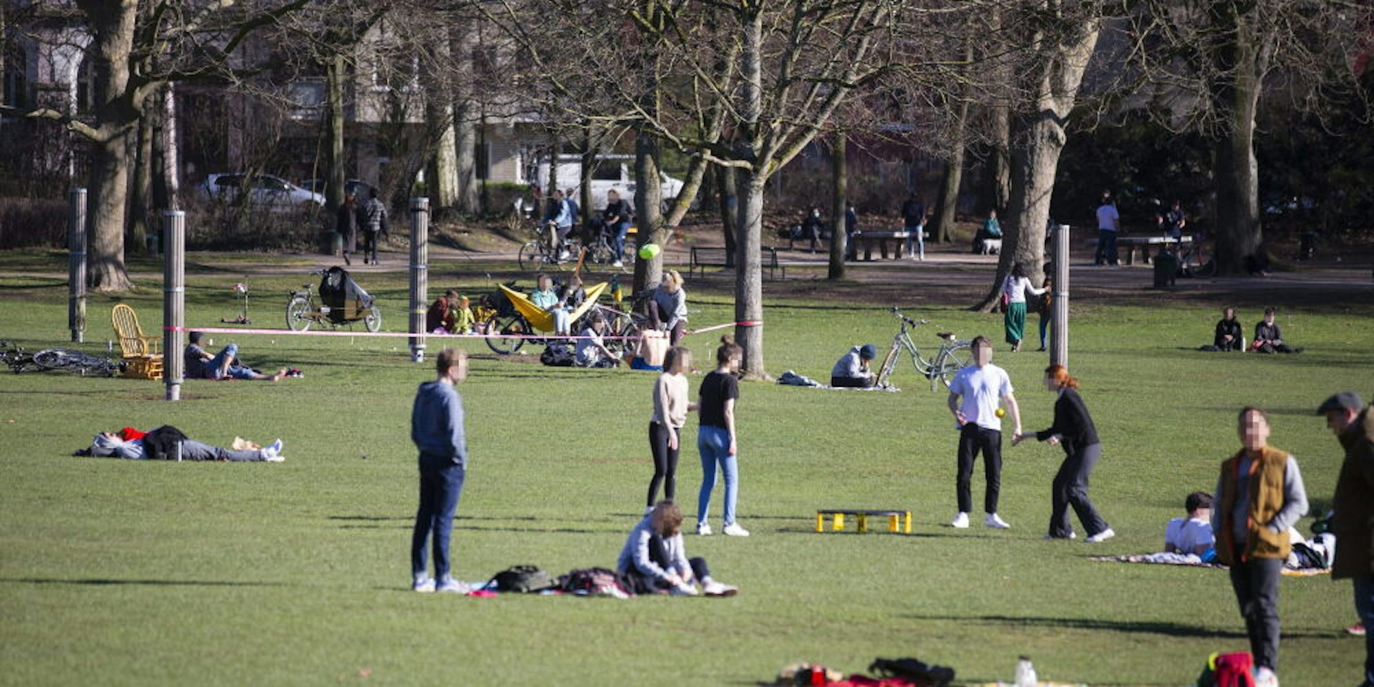 Während die wenigsten, die in den Parks spazieren oder Sport treiben, Maske tragen, wird die Abstandsregel meist befolgt. Im Volksgarten fallen allerdings vier Männer ohne Maske auf, die an einem Tisch rauchen, trinken und reden. 129 Mal spricht der Ordnungsdienst am Freitag und Samstag Personen auf die Maskenpflicht an. Bußgelder werden nicht verhängt.