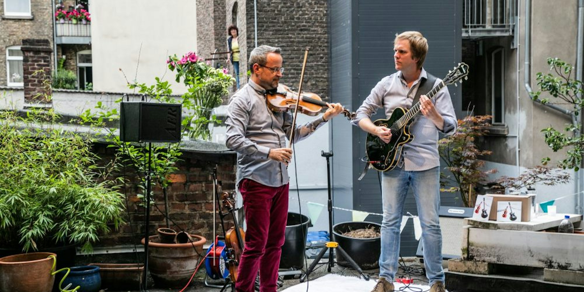 Improvisierte Bühne im Hinterhof: Geiger Sebastian Reimann und Gitarrist Georg Dybowski spielten im Agnesviertel.