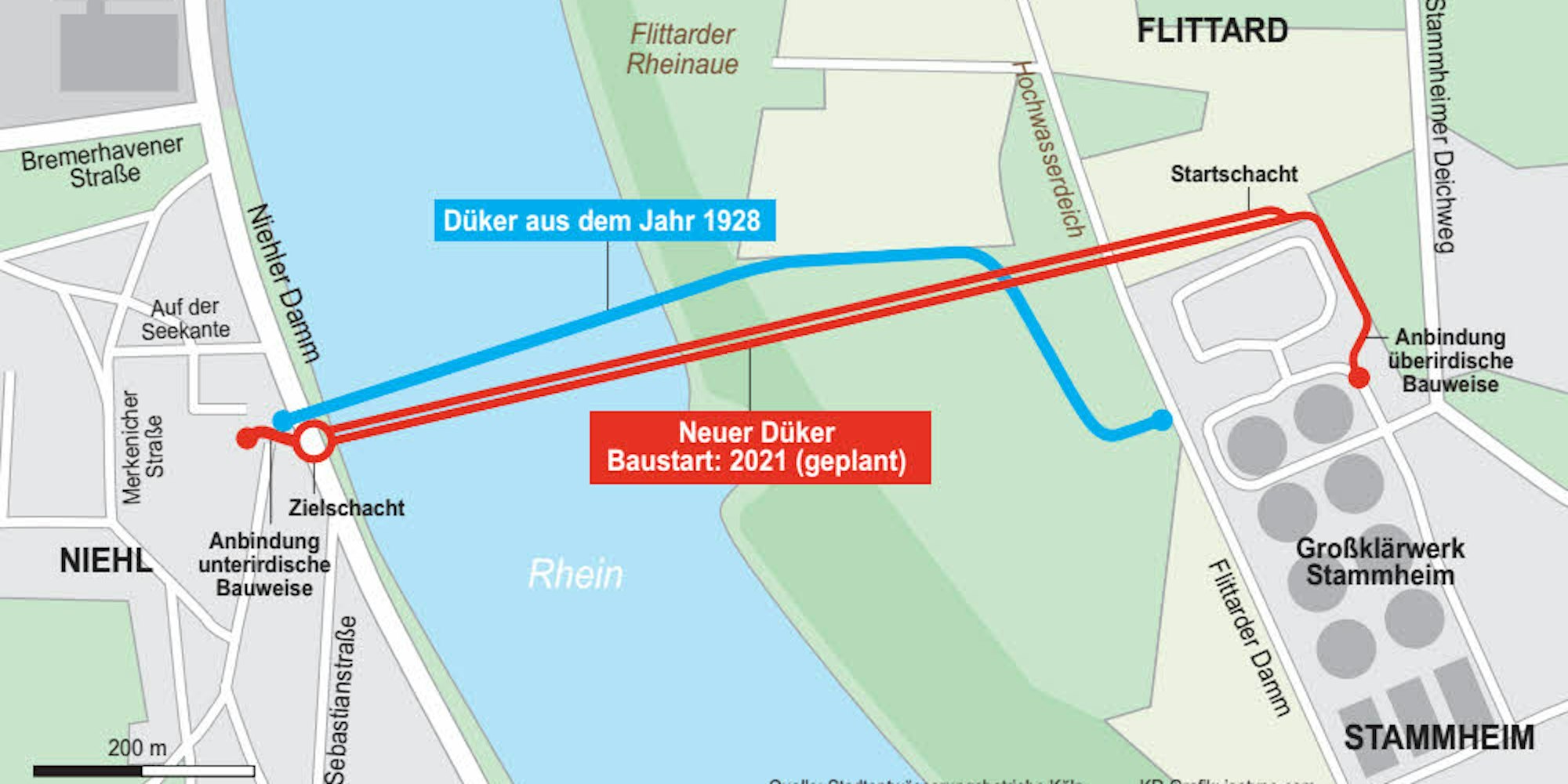 Der neue Düker wird, ebenso wie der alte, das linksrheinische mit dem rechtsrheinischen Köln verbinden. Der Startschacht liegt in Stammheim. Der Zielschacht entsteht in Niehl, parallel zum Standort des bisherigen Dükers. Der Baustart ist für Mitte des Jahres 2021 geplant. Der Abschluss der Rohbauarbeiten kann voraussichtlich 2023 erfolgen.