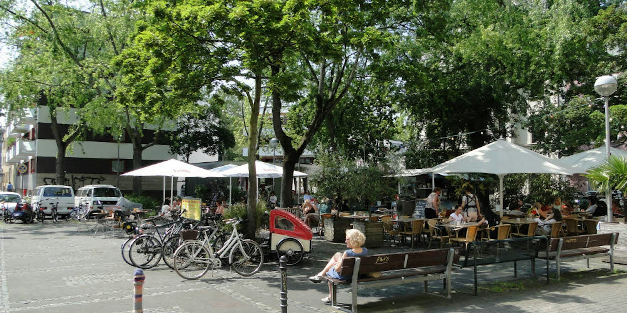 Zum Veedelstreffpunkt entwickelte sich der Platz vor allem durch die Außengastronomie der beiden Lokale, erinnert sich Kruse. „Anfangs bildeten sich noch Initiativen, die dagegen waren, weil sie den Lärm fürchteten“, sagt er. Davon ist inzwischen keine Rede mehr: Neben dem üblichen abendlichen Trubel finden auch Veranstaltungen wie Tango-Tanzabende oder Open-Air-Gottesdienste statt, im Winter baut der Nippeser Bürgerverein hier seinen Nikolausmarkt auf. „Ist doch schön, wenn man hier den jungen Leuten zugucken kann“, meint eine ältere Dame aus der nahen Hogenbergstraße, die es sich auf einer der Bänke gemütlich gemacht hat.