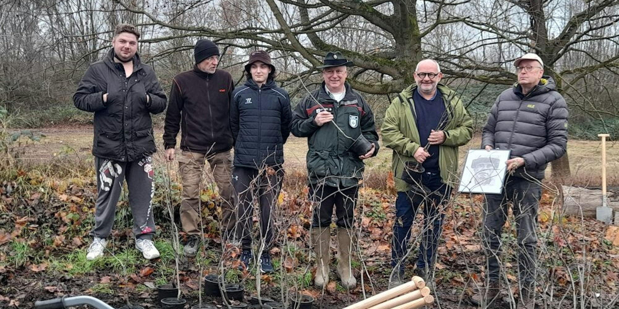Die Baumpflanzer, darunter Rüdiger Ramme (2.v.r.) versammeln sich am Heckhofweg.