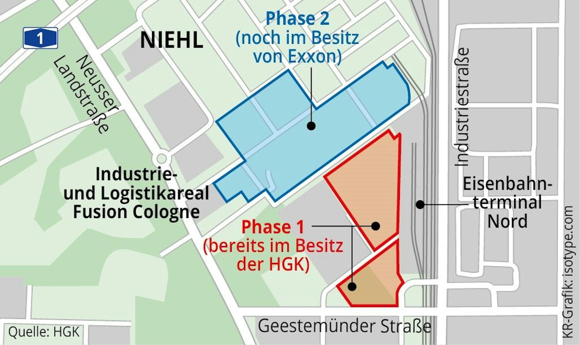 Zunächst sollen die 17,4 Hektar neben dem Bahnterminal vermarktet werden, die der HGK bereits gehören. Auf diesen Flächen soll ab dem dritten Quartal 2023 gebaut werden. Eine Fläche weiter nördlich, die derzeit noch dem Mineralölkonzern Exxon gehört (siehe Grafik), will die HGK kaufen und in einer zweiten Phase ab Ende 2025 entwickeln.