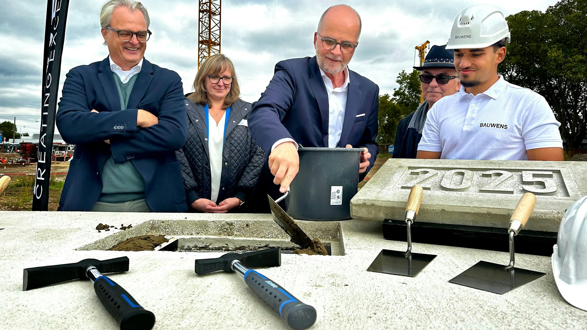 Grundsteinlegung unter anderem mit Alexander Jacobi, Katja Wilken und Markus Greitemann (v.l.).