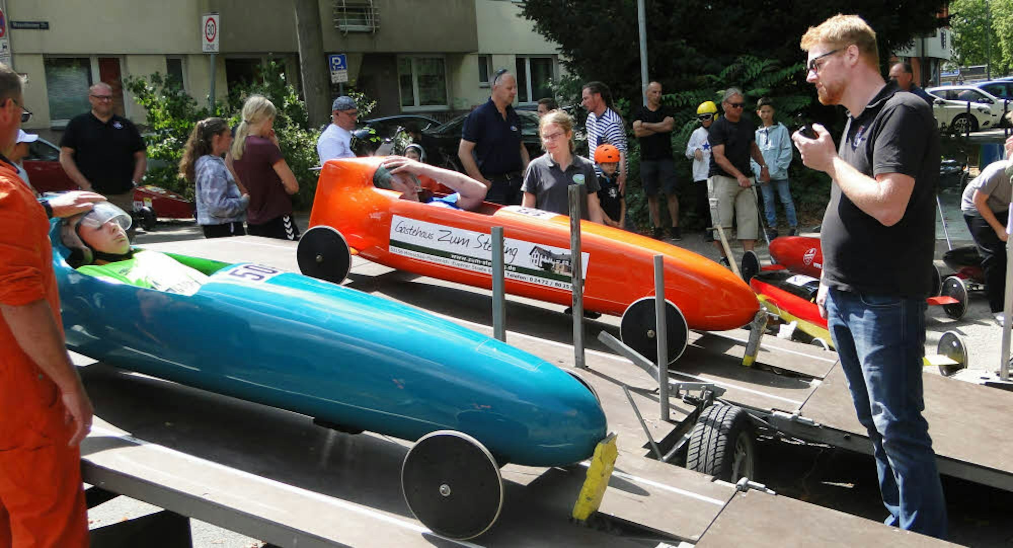 Doch das Rennen dient nicht nur Sport und Spaß, sondern hat auch einen pädagogischen Hintergrund: Etwa 20 Fahrer unter den Startern stammen von Kölner Schulen, an denen Con Action seine sogenannten Praxisstationen unterhält. „Das ist eine Maßnahme der Berufsorientierung, in deren Rahmen wir die Schüler ein Schuljahr lang an ihrer Seifenkiste bauen lassen“, so Naumann. Dafür böten sich die Gefährte in besonderem Maße an, weil ihr Bau gleich mehrere Gewerke handwerklicher Berufe in Anspruch nimmt. „Metallbau kommt etwa zum Einsatz, für den Bau der Steuerungs- und der Bremseinheit wird Mechanik benötigt, beim Anmalen kommen Maler und Lackierer zum Einsatz“, zählte Naumann auf.