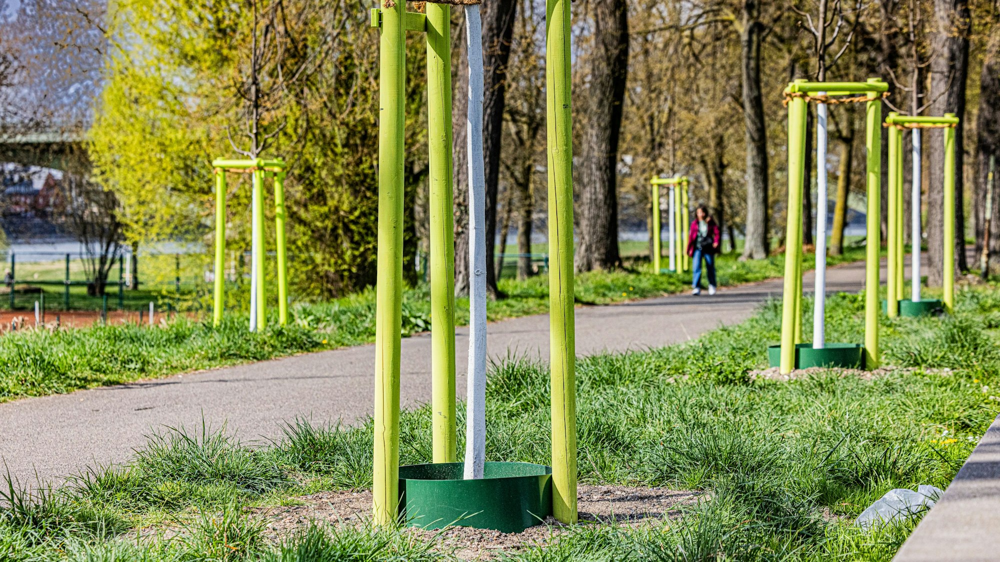 An der Alfred-Schütte-Allee wurden die neu gepflanzten Bäume weiß gestrichen und mit wassersparenden Ringen versehen