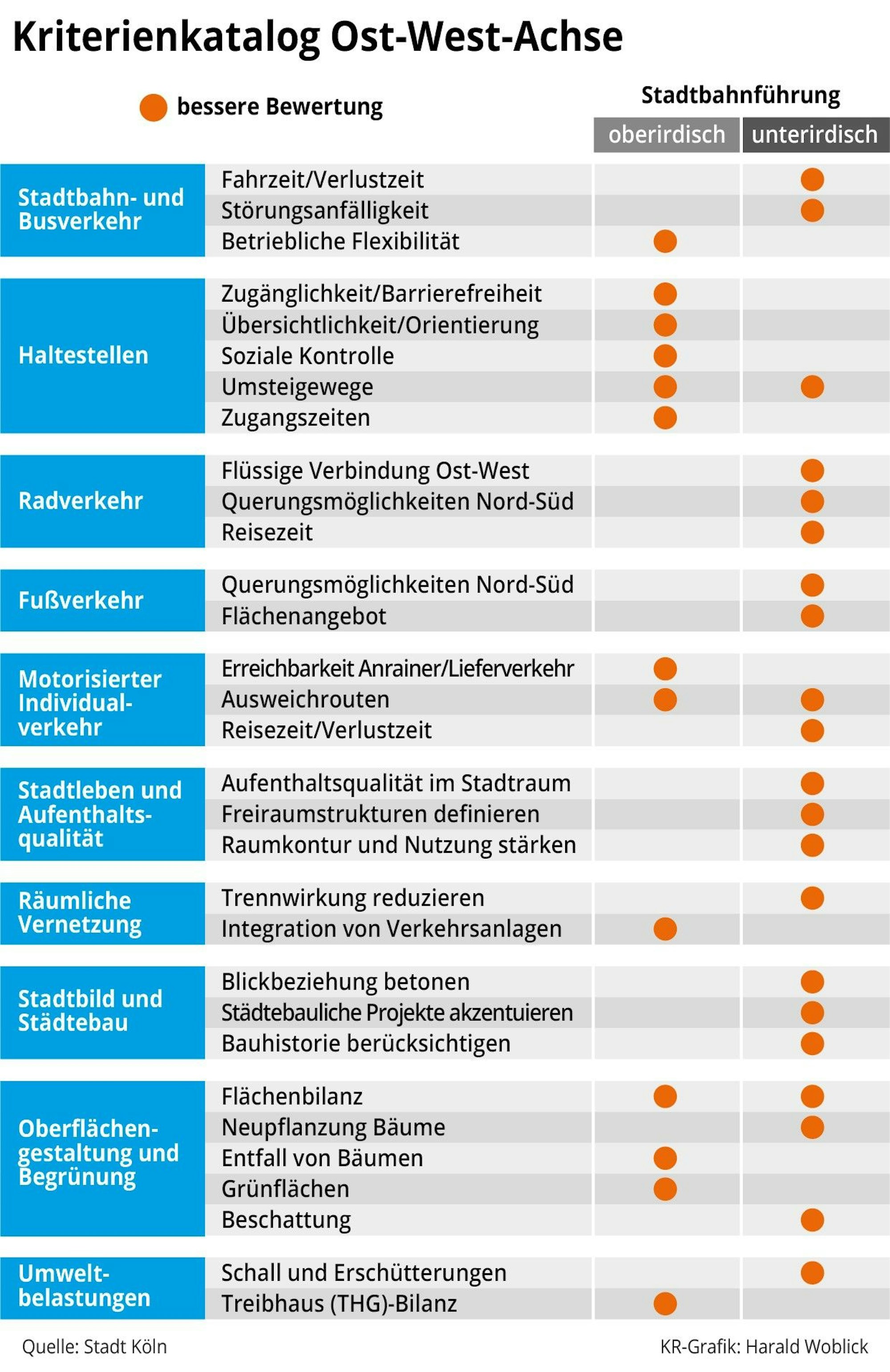 Es dürfte eine der heiß diskutierten Fragen in den kommenden Tagen werden: Soll auf der Ost-West-Achse, also zwischen Heumarkt und Aachener Weiher, ein Stadtbahntunnel gebaut werden oder soll es stattdessen einen oberirdischen Ausbau dieses Abschnittes geben? Einige haben sich bei dieser Frage schon unverrückbar positioniert, wie beispielsweise die Initiative „Oben bleiben“ für die oberirdische Variante, oder die Kölner Verkehrs-Betriebe, die den Tunnel bevorzugen. Für alle, die ihre Position noch suchen, bietet die am Mittwoch veröffentlichte Vorlage für den Stadtrat, der sogenannte Variantenentscheid mit nicht weniger als 50 Anlagen, eine gute Grundlage zur Meinungsfindung.