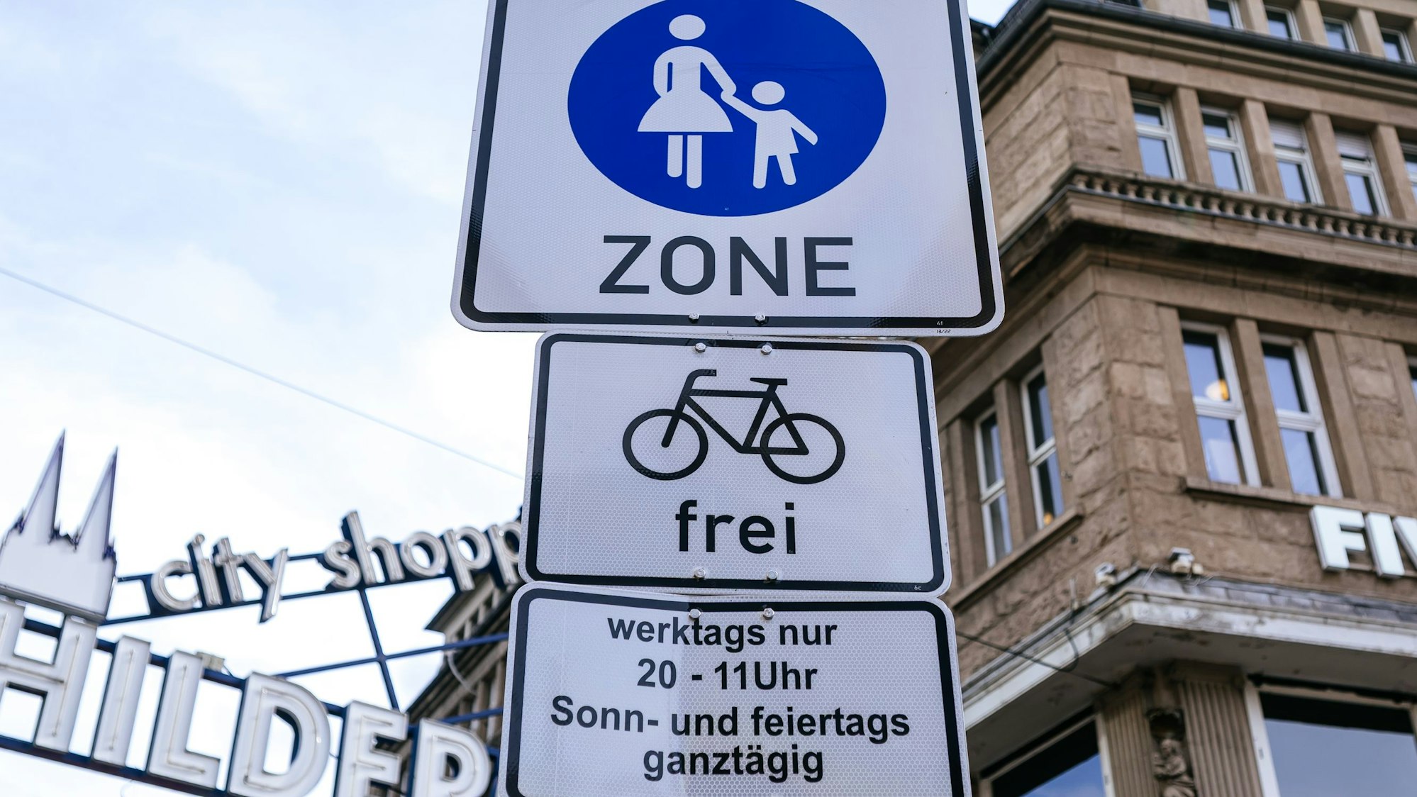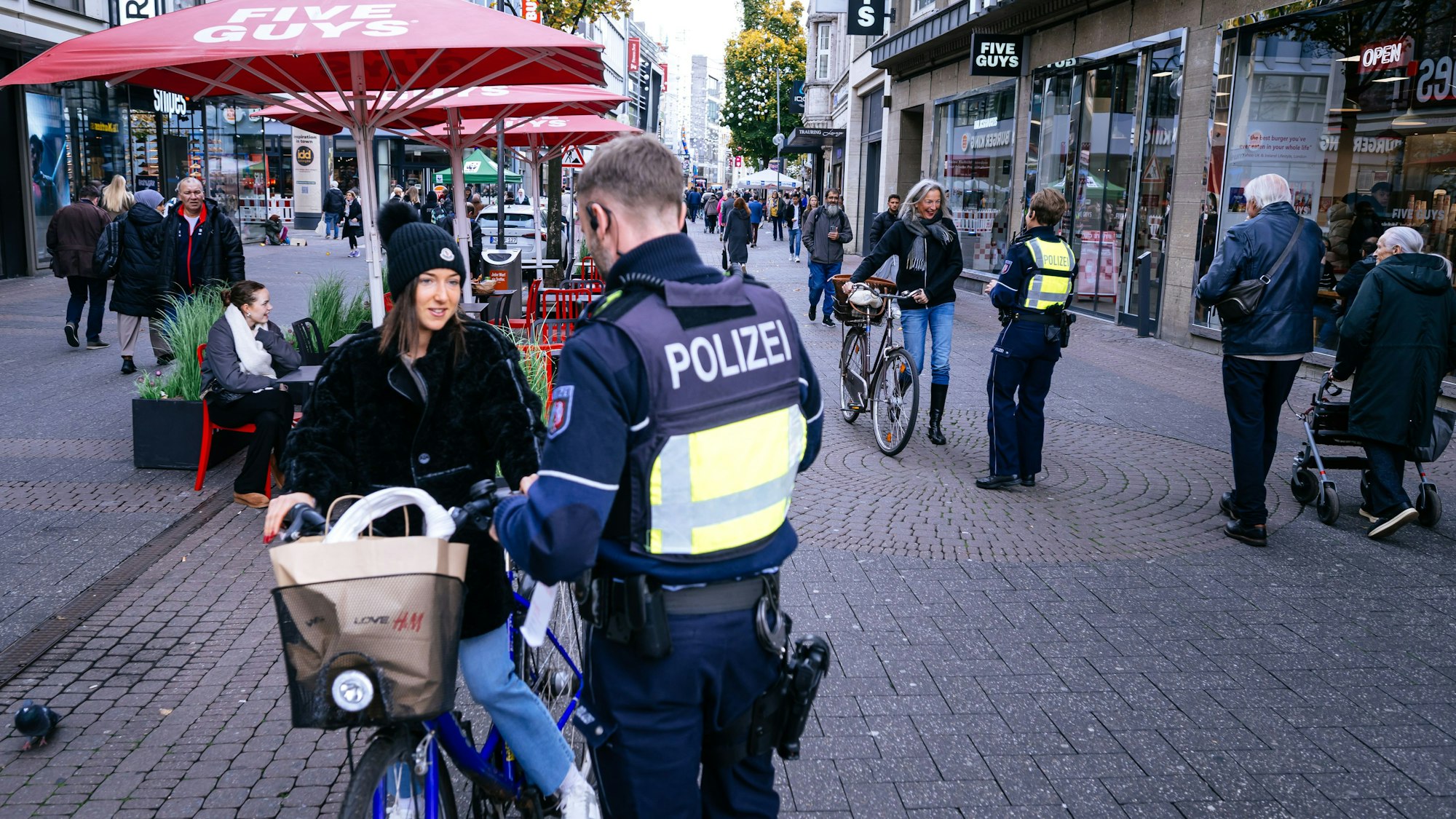 Unter dem weiß-blauen Schild „Fußgängerzone“ hängt ein weiteres Schild: „Radfahrer frei“. Noch klein gedruckter ist ein drittes Schild: Erlaubt sind Fahrräder hier werktags nur von 20 bis 11 Uhr sowie ganztägig an Sonn- und Feiertagen. In der Schildergasse gibt es so einige, die das überlesen — oder vielleicht auch bewusst ignorieren. Am Mittwochmittag wartete die Polizei auf sie. Es ging dabei weniger um Knöllchen, als um Aufklärung.