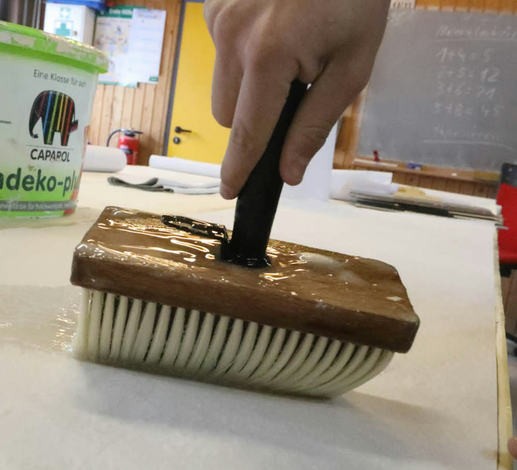 In der zeigt Malermeister Hardy Berscheid ein paar Achtklässlern, wie man richtig tapeziert. Vier Jungs schauen zu, wie er den Kleister auf einer Tapetenbahn verteilt. Später sollen sie es ihm gleichtun. Kristofer ist der erste, der zum Pinsel greift. Er bekommt von Berscheid noch einen Tipp zur Weichzeit, die Zeit, in der die Tapete „wächst“, weil sie durch den Kleister Feuchtigkeit aufgenommen hat.