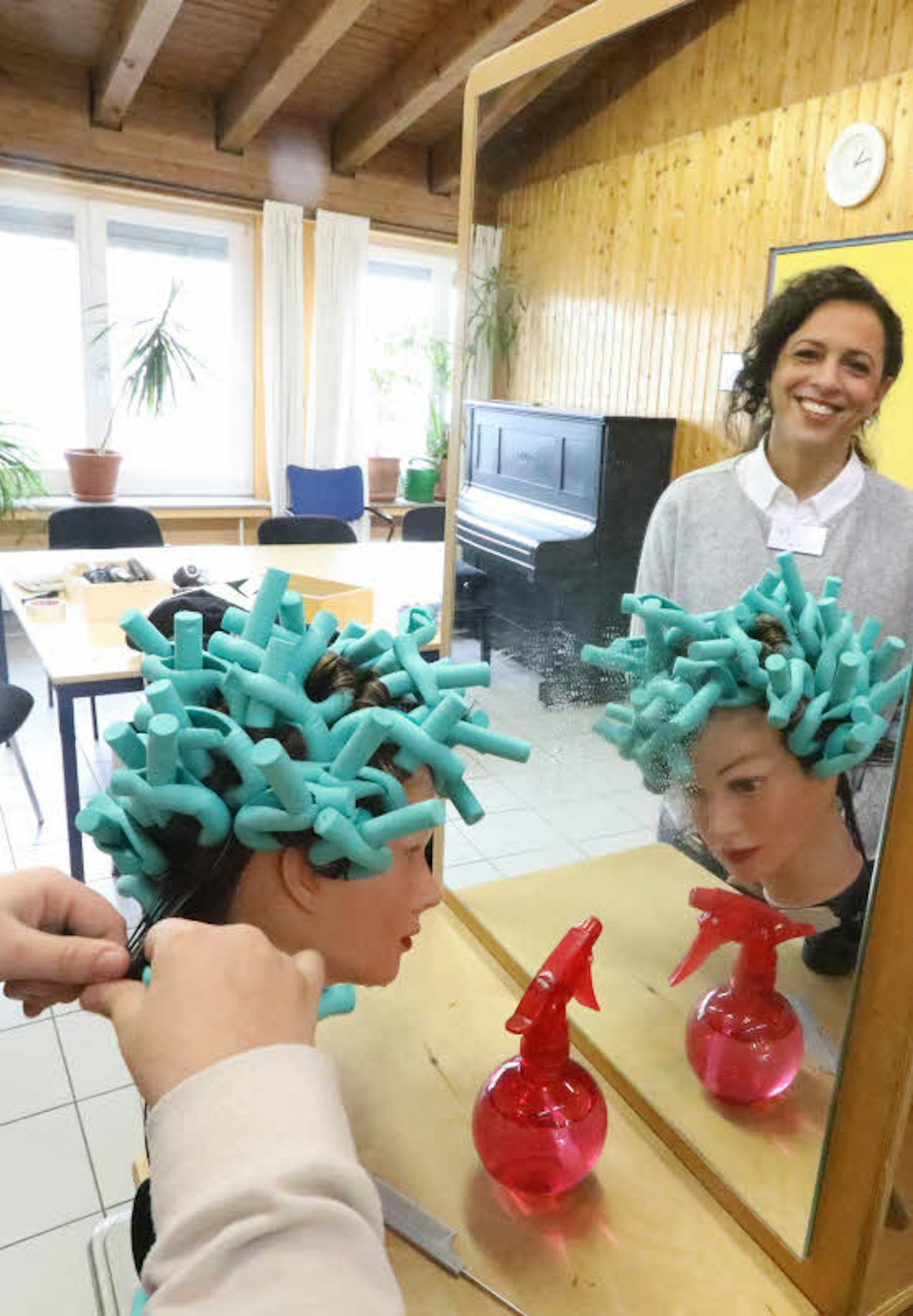Während Nikita und sein Schulkamerad aus der achten Klasse der Zündorfer Hauptschule noch teilweise ihren „Bad-Hair-Day“ haben, klappt es bei Lisa schon richtig gut. Für sie ist die Übung kein Problem, macht sie sich zu Hause doch selbst immer mal die Locken. „Die drehe ich auf Stifte auf“, erzählt sie. Hier in der Jugendwerkstatt der Jobwerk gGmbH probiert sie sich an Papilotten, Lockenwicklern aus Schaumstoff, die man auch nachts in den Haaren tragen kann – „und dabei sogar schlafen kann“, klärt Fröde auf.