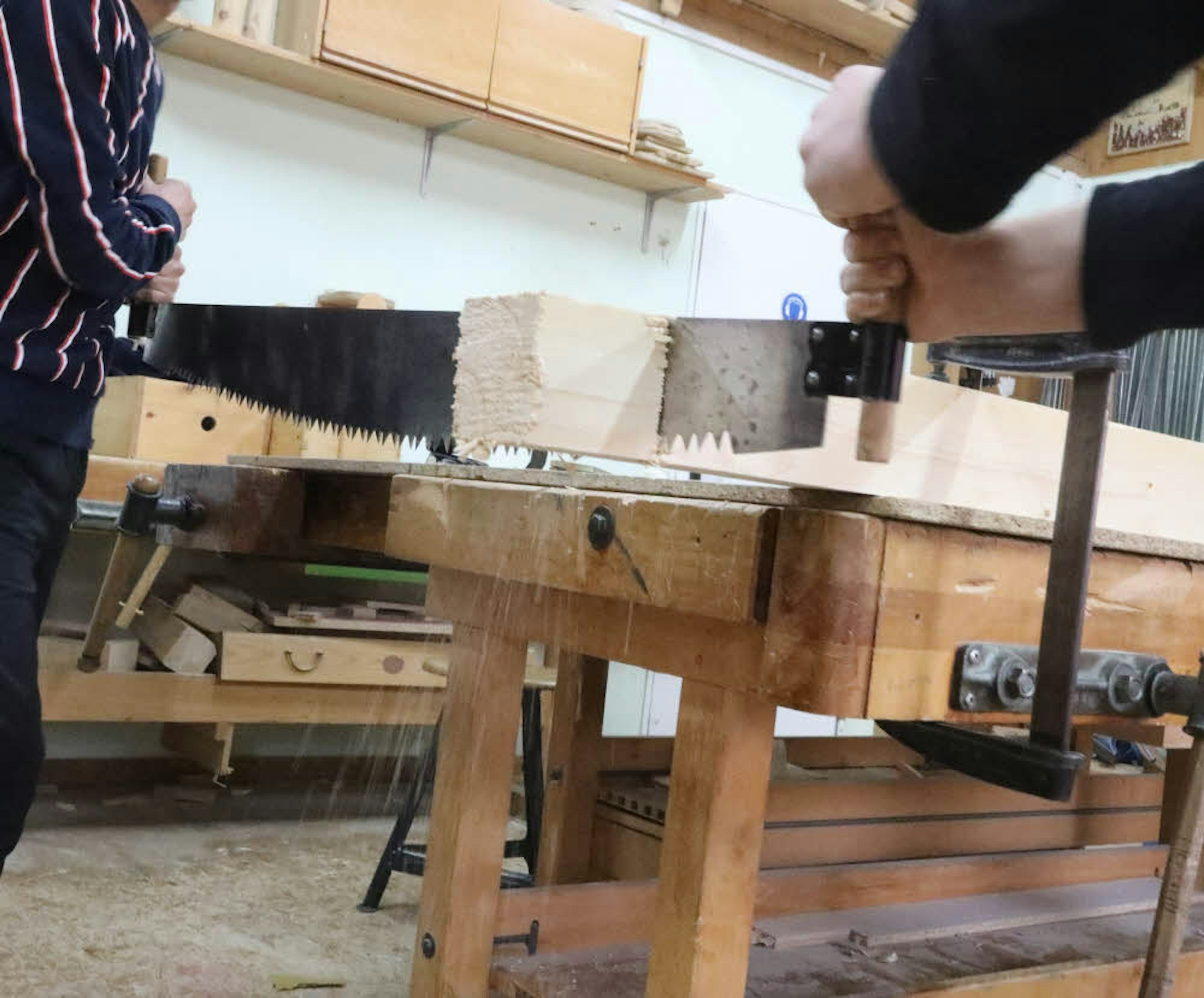Bei Jürgen Exner ist es das Holz, das im Mittelpunkt steht. Auch hier dürfen sich die Jugendlichen ausprobieren. Mit dem Handhobel haben sie schon gearbeitet. Jetzt kommt die Säge dran. Und da hat sich Exner ein besonderes Exemplar ausgesucht: Eine Säge, die man nicht alleine benutzen kann, die sogenannte Zweiersäge, an deren Enden jeweils eine Person steht. „Sie funktioniert nur, wenn beide zusammenarbeiten.“ Nicht umsonst heißt sie im Russischen auch „Freundschaftssäge“.