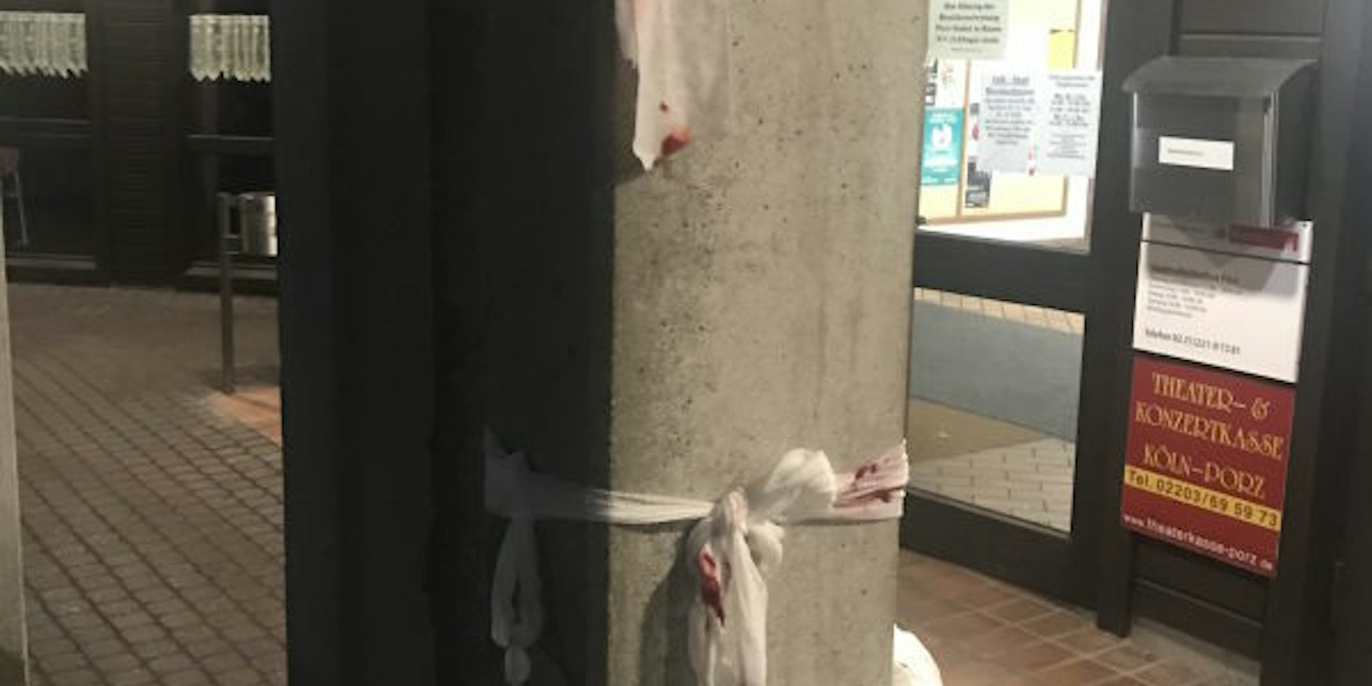 Porz – Auch nach ihrer Protestaktion in der Bezirksvertretung (BV) Porz haben die Demonstranten vor dem Rathausgebäude ein weiteres Zeichen gesetzt: An Pfeilern zum Eingang des Bildungszentrums des Bezirksrathauses hatten sie die blutrot eingefärbten Verbände, die sie zuvor bei der Protestaktion getragen hatten, angebunden. „Ein Monat Schweigen und Vertuschung“ hatten sie zuvor gemahnt und damit auf den Vorfall am Ende vergangenen Jahres am Rheinufer angespielt. Hier steht der nun zurückgetretene CDU-Politiker Hans-Josef Bähner im Verdacht, einem 20-Jährigen Mann unter Alkoholeinfluss in die Schulter geschossen zu haben. Es ging wohl um Ruhestörung.