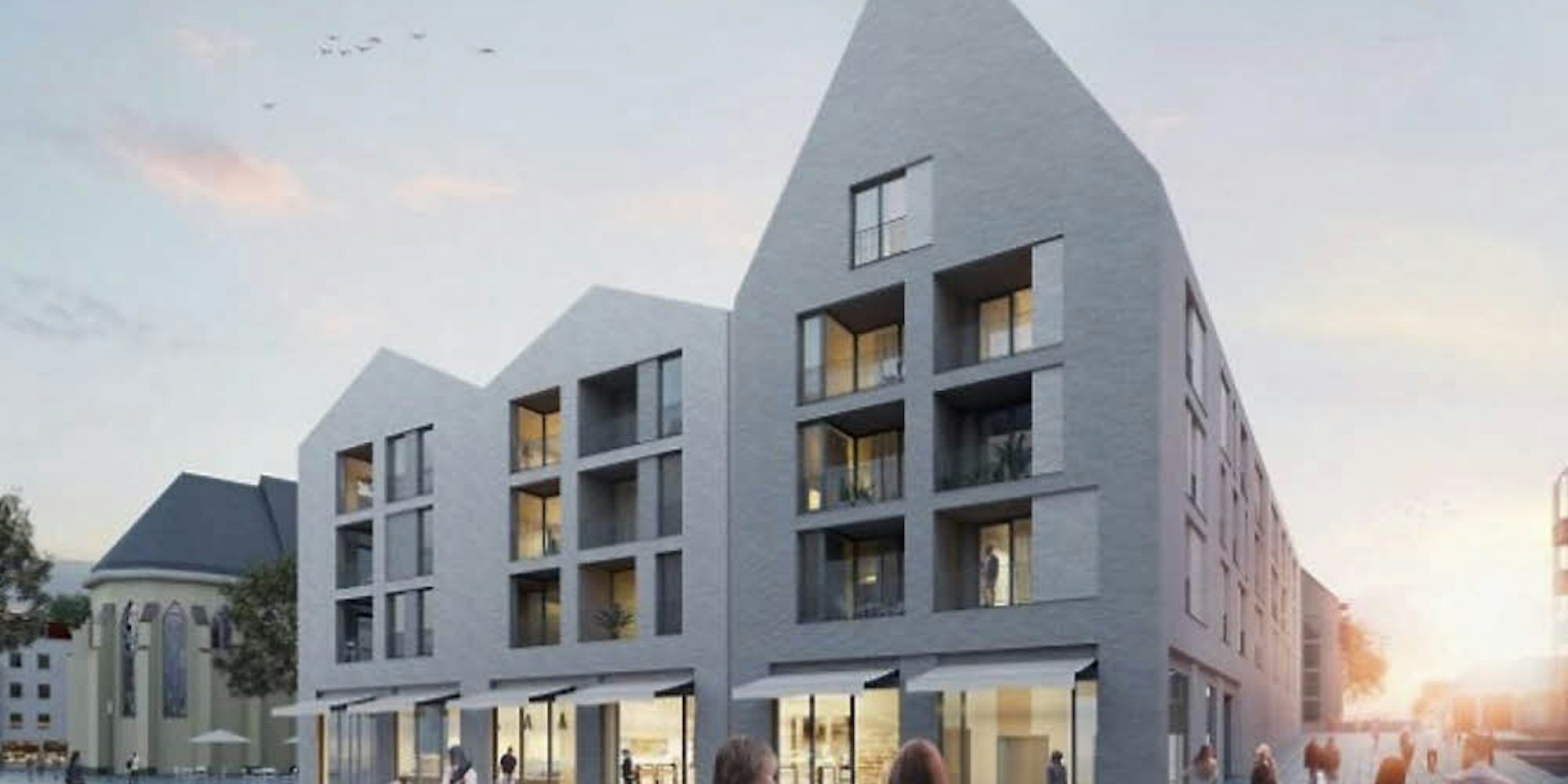 Die Ansicht von Haus 1. Auf der jüngsten Sitzung der Bezirksvertretung bestätigte eine Mitarbeiterin der Stadt, dass für das Erdgeschoss Verhandlungen mit Rewe laufen.