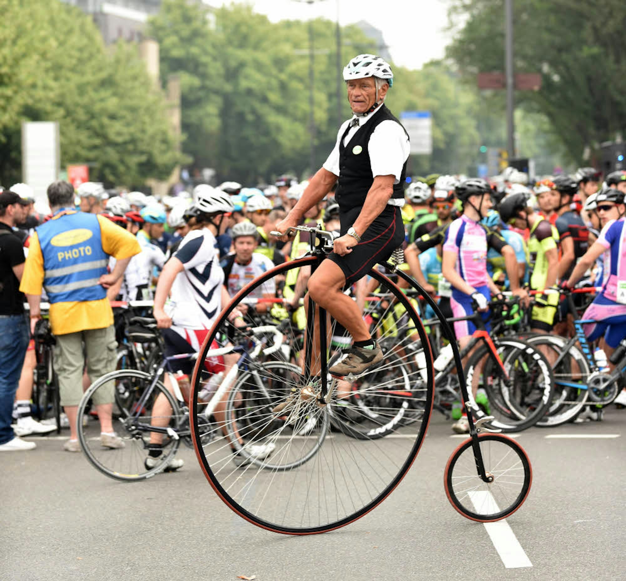 Hauptsache mit Helm: Helmut Arnold hat das Teilnehmerfeld auf seinem Hochrad gut im Blick, er fuhr einen Teil des Jedermannrennens mit.