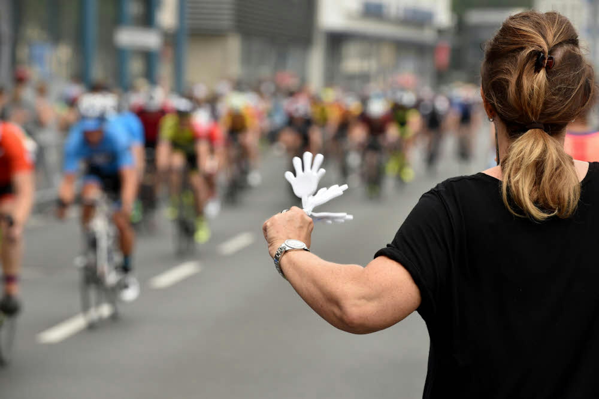 Alle Hände voll zu tun hatten auch die Zuschauer auf der Rheinuferstraße bei „Rund um Köln“.