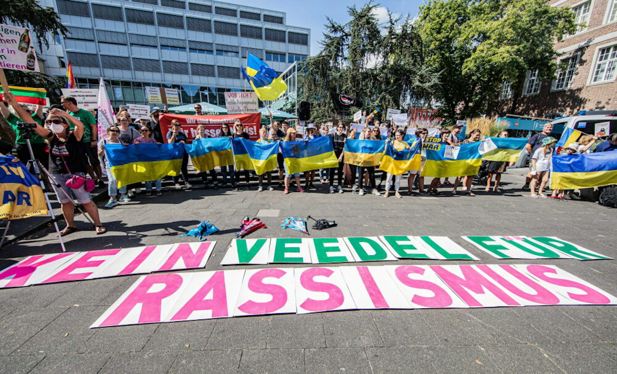 Auch linksgerichtete Gruppen und vorwiegend junge Menschen, die zur „Antifa“ zählen, waren unterwegs. Ebenfalls auf der anderen Seite des Zuges: Menschen aus der Ukraine und Exil-Russen, die die blau-weiße Fahne des Protests gegen den russischen Angriffskrieg trugen.