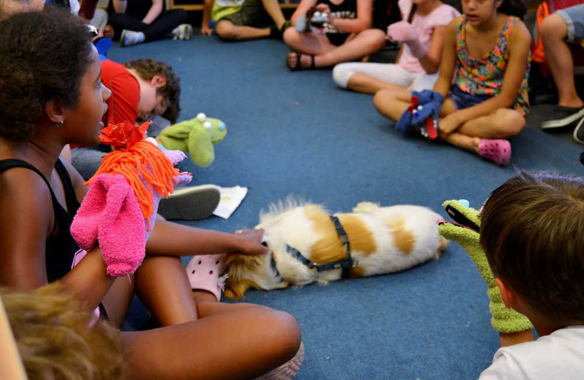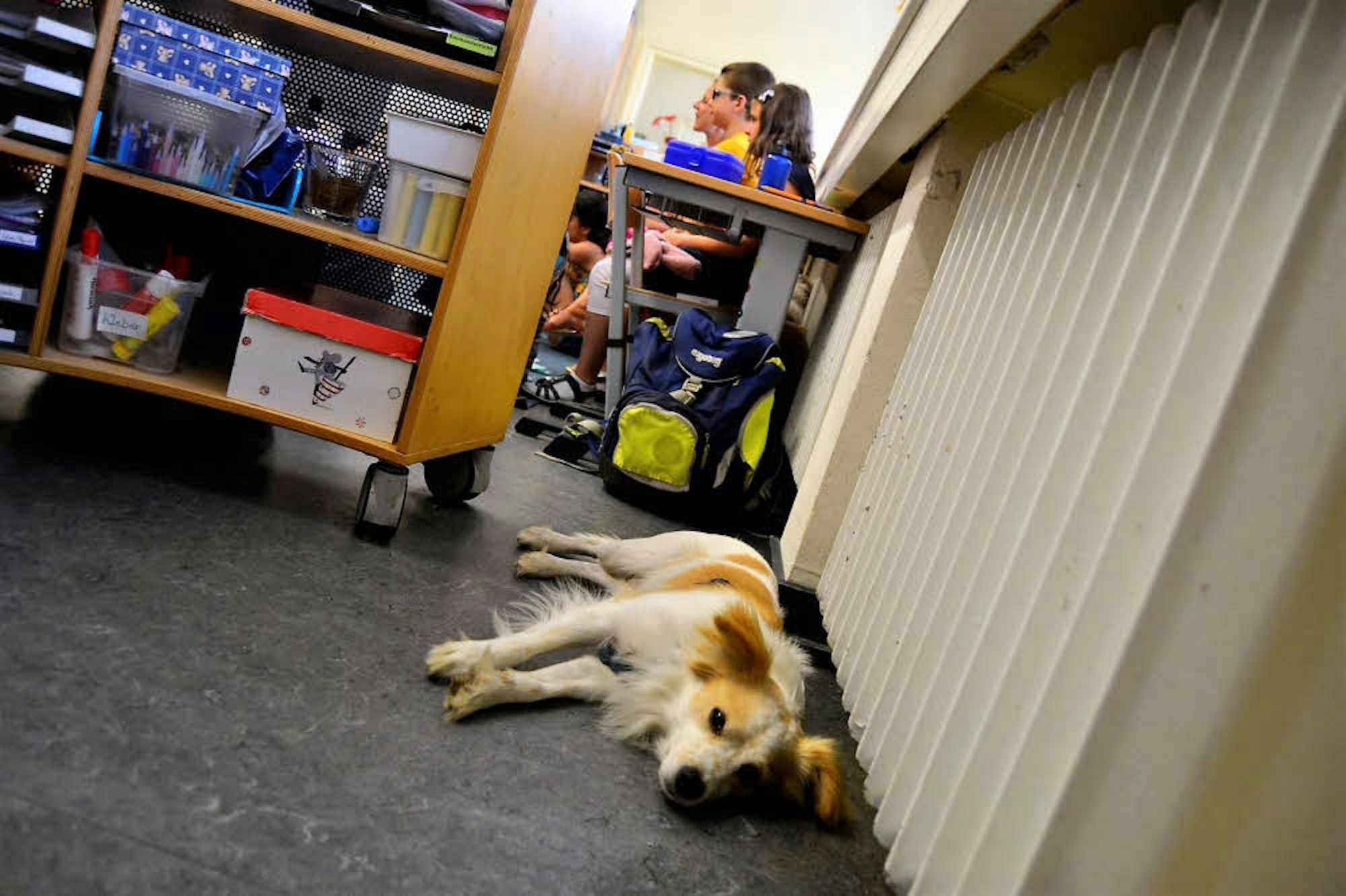 Hechelnd wegen der Hitze an diesem Tag, aber entspannt, liegt Paulchen auf dem Fußboden und den Kindern der „Hundeklasse“ zu Füßen. Paulchen gehört Lehrerin Dorothee Hermisch und ist der Schulhund der Nikolausgrundschule.