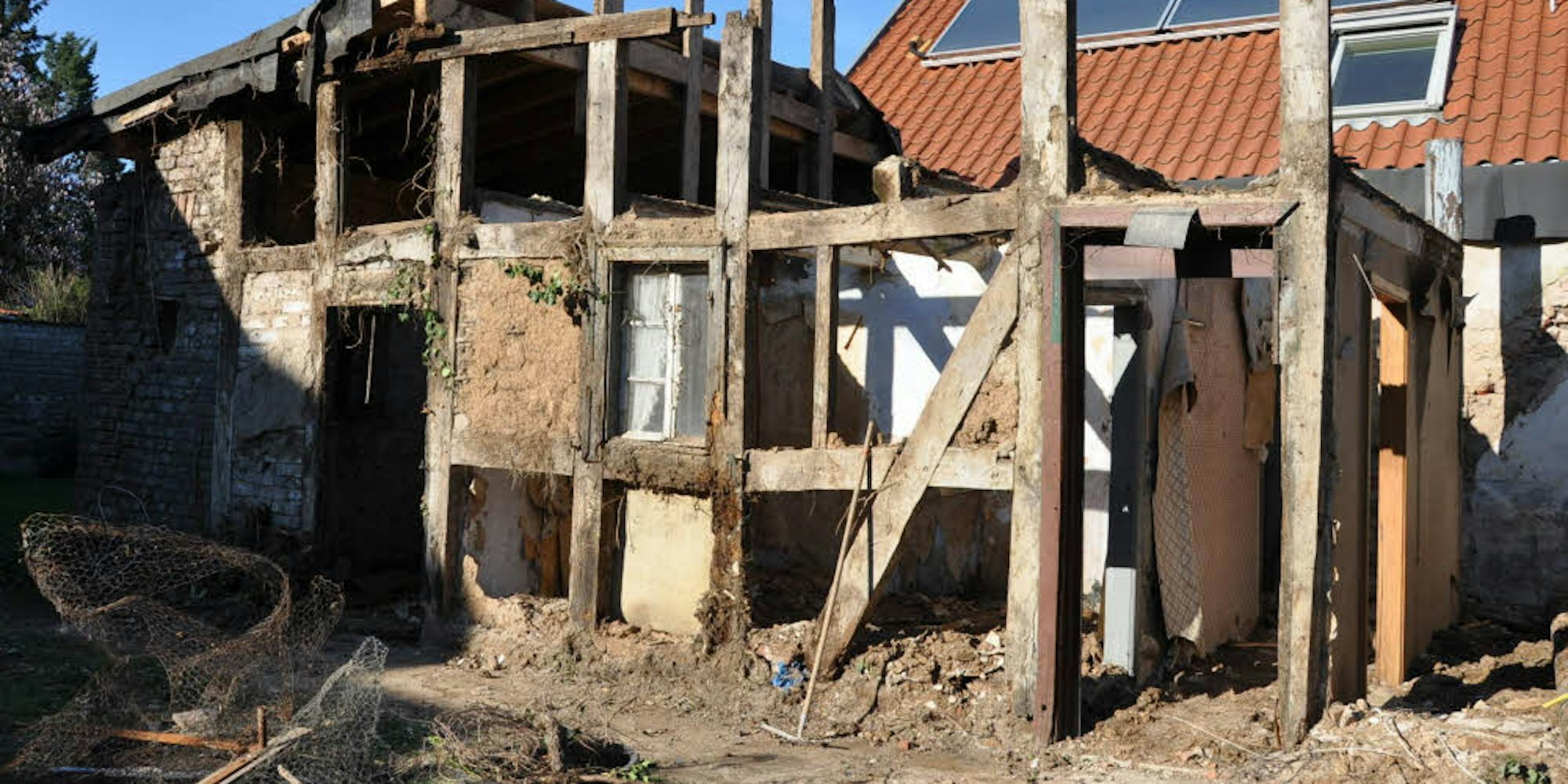 In Eigenleistung trägt der handwerklich versierte 43-Jährige, wenn es die Zeit zulässt, Stein für Stein ab, säubert die Klinker und sammelt sie. Denn später möchte er sie für den Neubau wieder verwenden. Sortiert wird nach Eisen, Müll und Steinen. Am Anfang hatte er gehofft, die Fachwerkbalken noch verwenden zu können. „Hier ist aber alles baufällig“, weiß er mittlerweile.