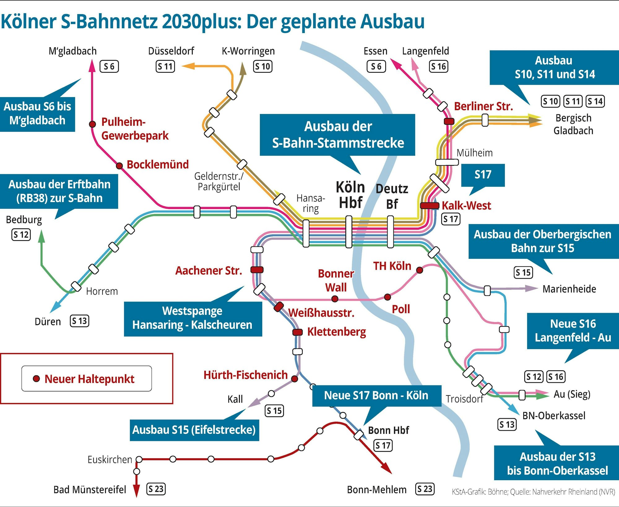 Auf der Stammstrecke der S-Bahn zwischen dem Bahnhof Messe/Deutz und dem Hansaring werden pro Richtung künftig 24 statt 15 Züge pro Stunde fahren können. Nach der geplanten Digitalisierung und der Einführung automatisierter Zugsysteme wären sogar bis 33 Züge pro Richtung und Stunde möglich. Auf den Eifelstrecken, die Ende 2028 alle elektrifiziert sein sollen, werden S-Bahnen nach Fertigstellung der Trassen bis Hürth-Kalscheuren die Regionalzüge ersetzen. Sie sind schneller und in einem dichteren Takt unterwegs.
