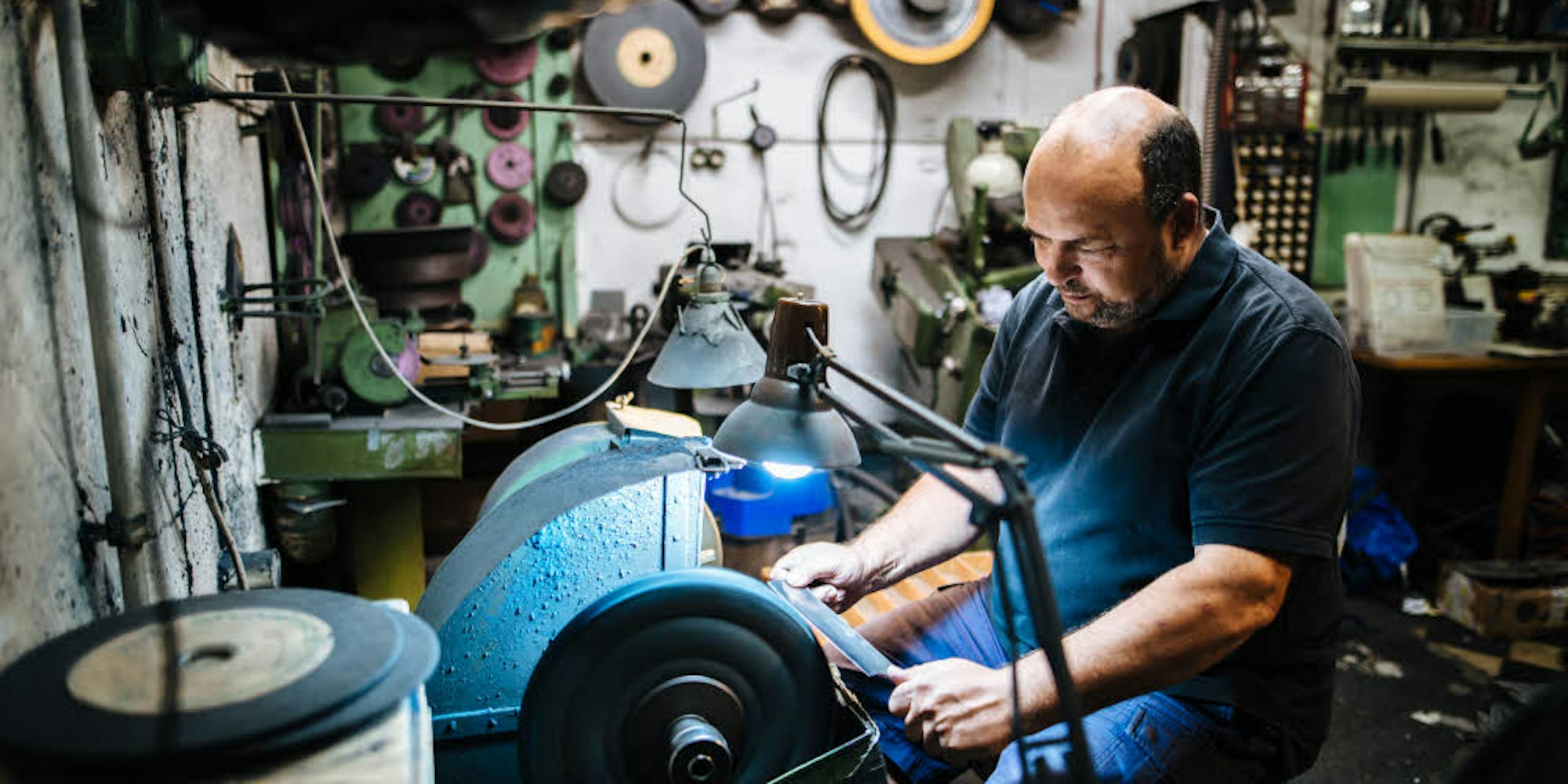 Schönfeld öffnet die alte Tür mit der Durchreiche. Dahinter verbirgt sich die Werkstatt, das Herzstück seiner Schleiferei. Auch hier ist die lange Familientradition zu erkennen. Über einige ganz alte Maschinen, die kaum noch benutzt werden, hat sich sanft der Schleifstaub gelegt. Zum Beispiel über den Schleifbock aus Vorkriegszeiten, der noch mit Wasserkühlung funktioniert und über einen Riemen angetrieben wird. Ganz früher stand dafür extra ein Elektromotor im Keller.