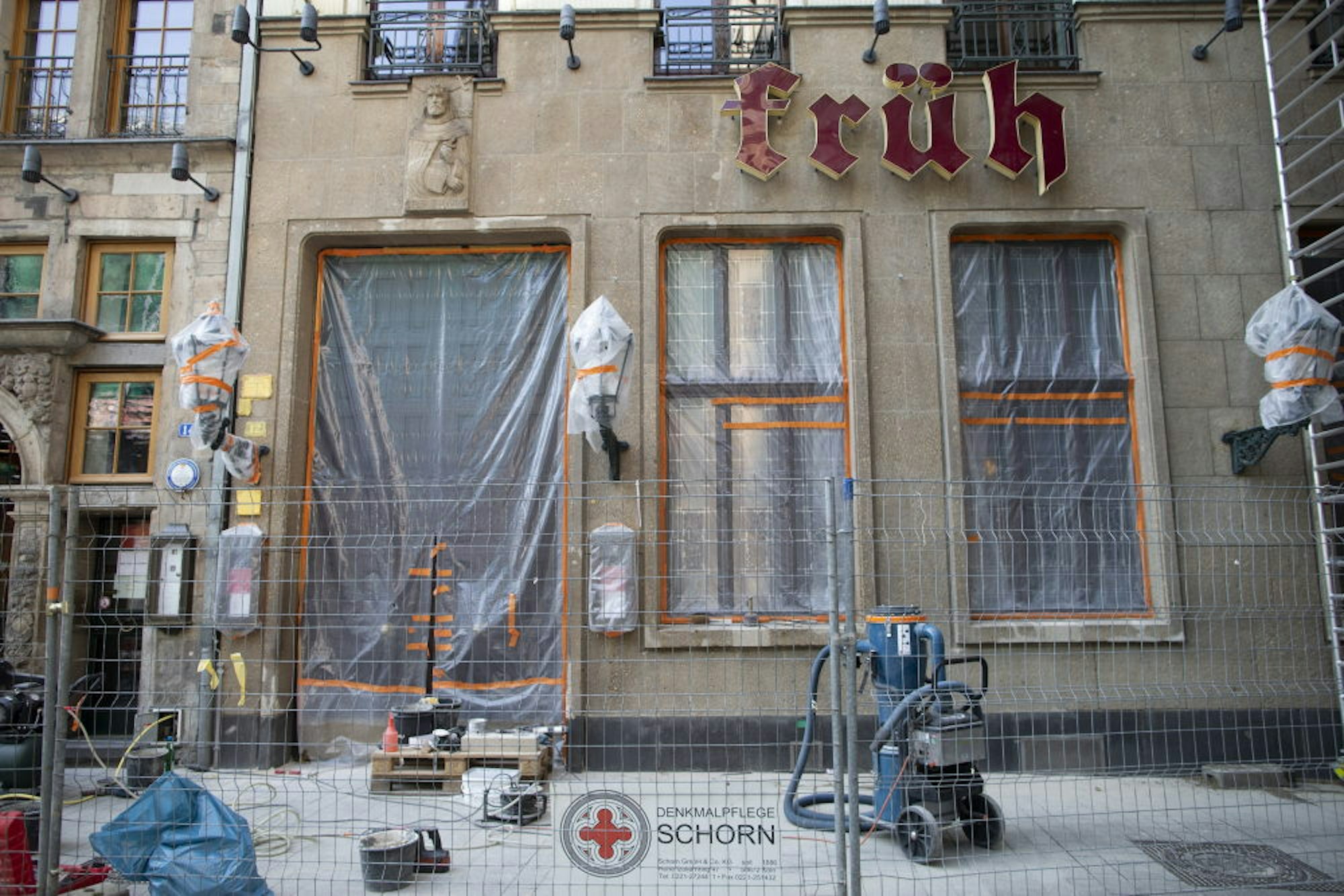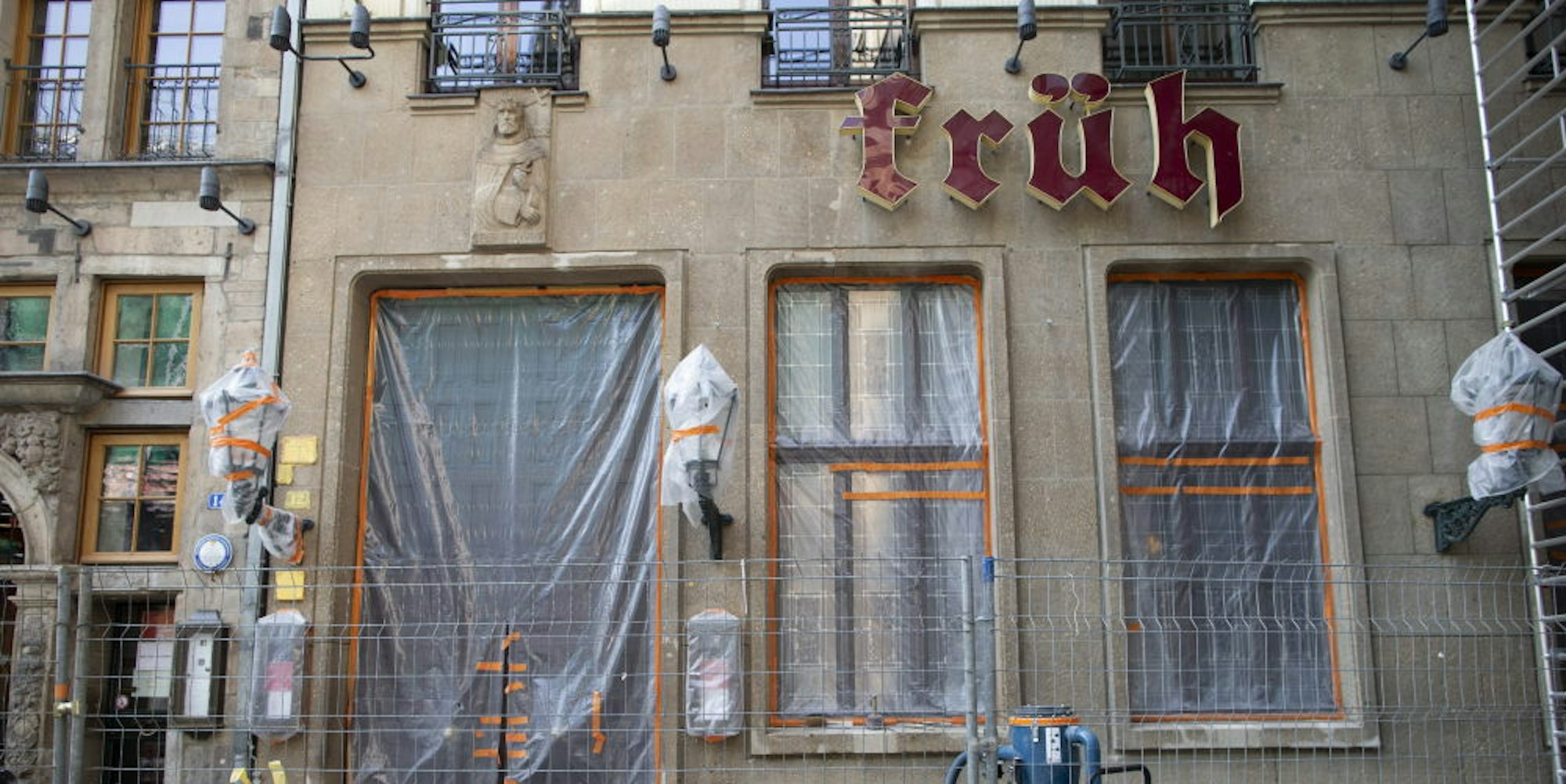 Im Brauhaus „Früh“ in der City wird die Fassade neu gemacht. Die Arbeiten waren schon vor der Krise geplant.