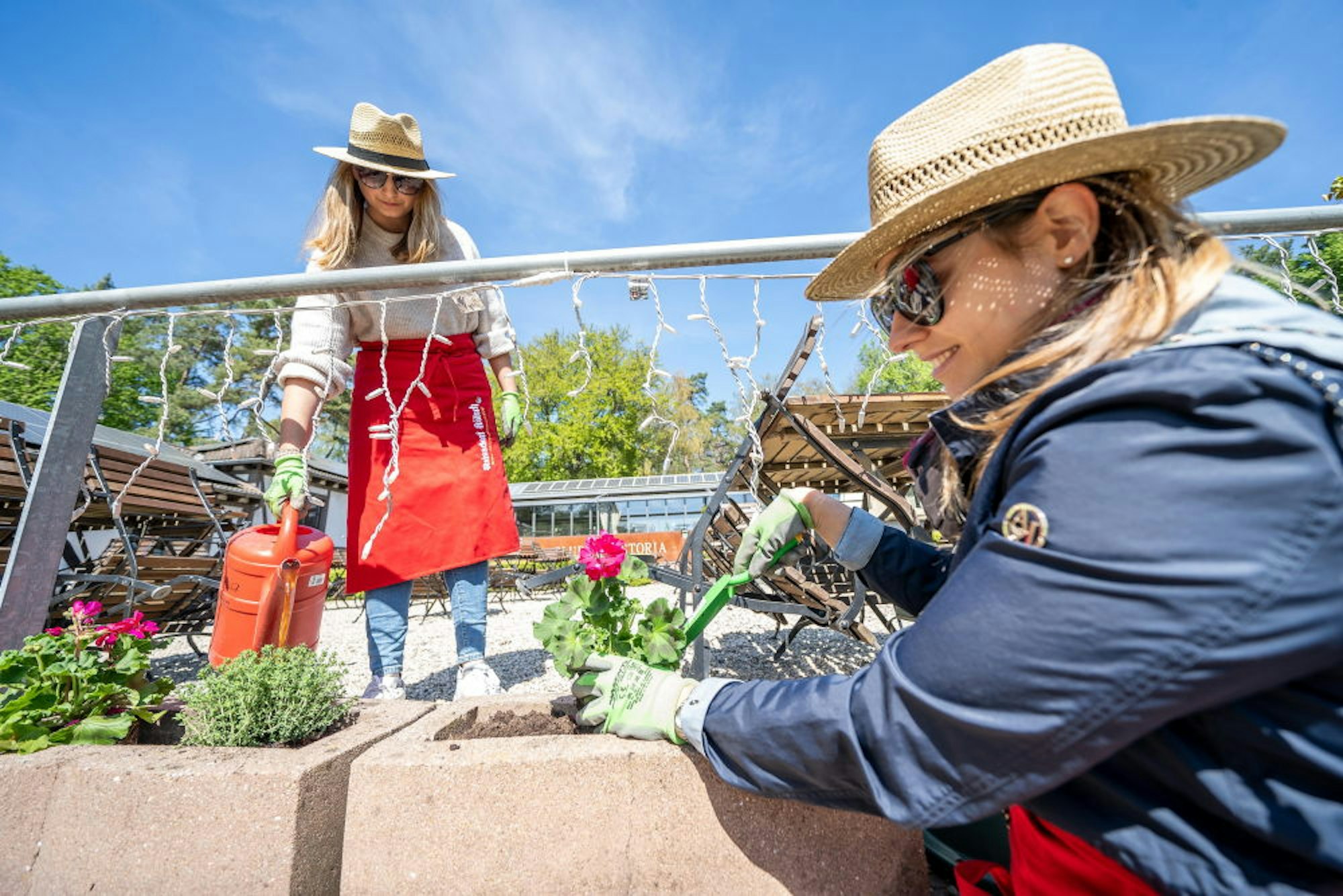 Blumenpracht lassen Elena (l.) und Laura Bechthold vom Club Astoria in der Zwangspause rund um den Biergarten sprießen.