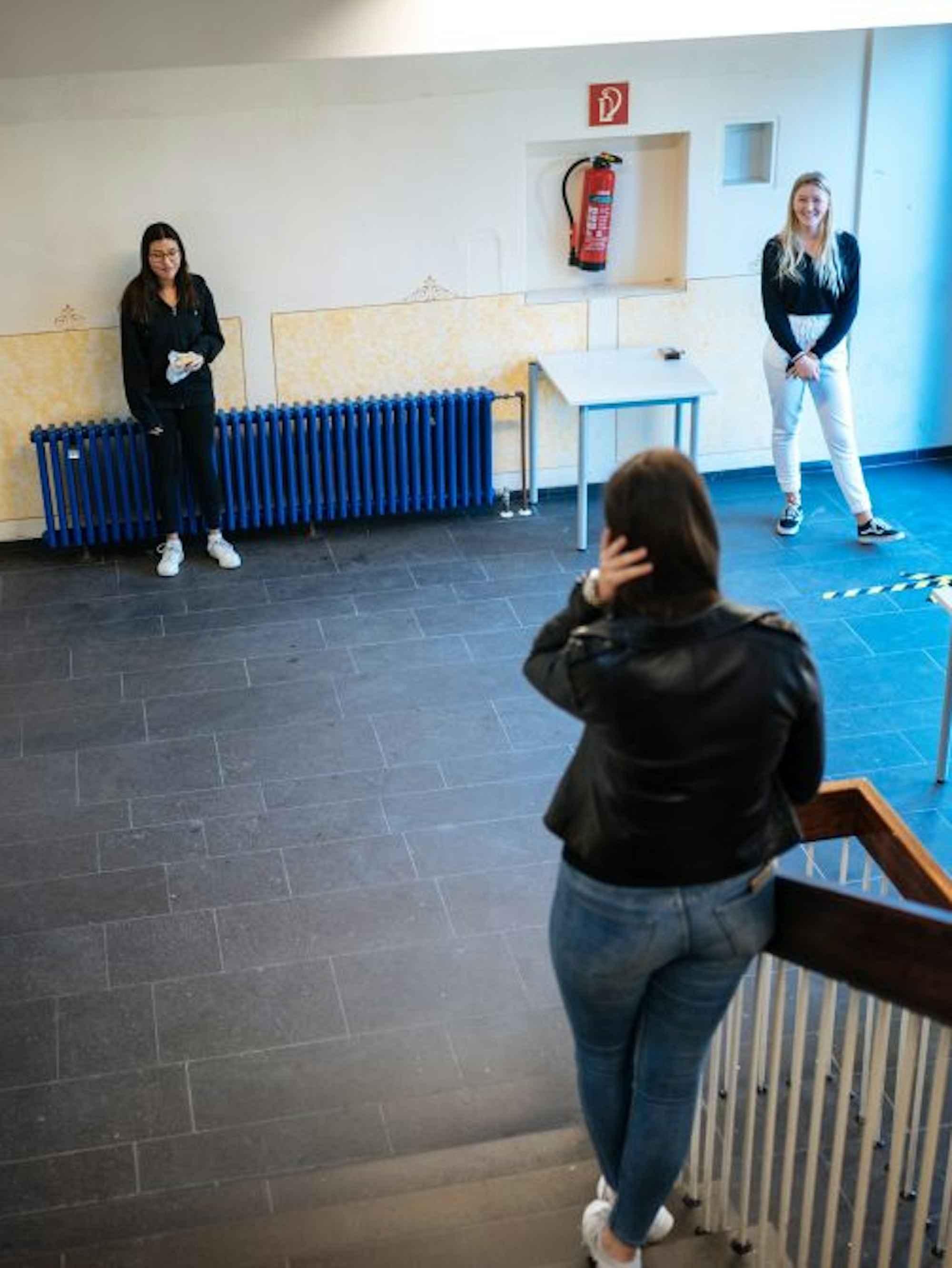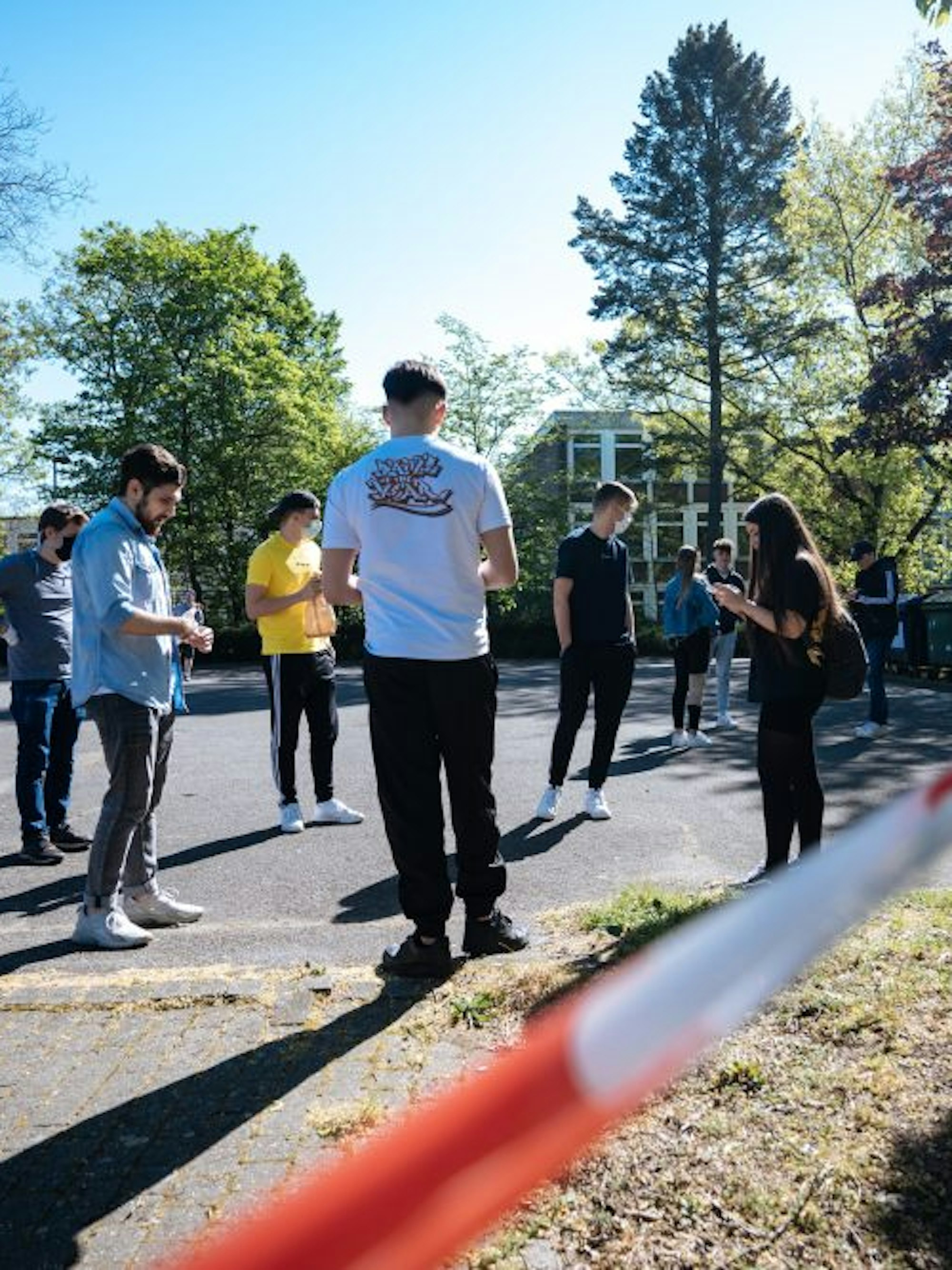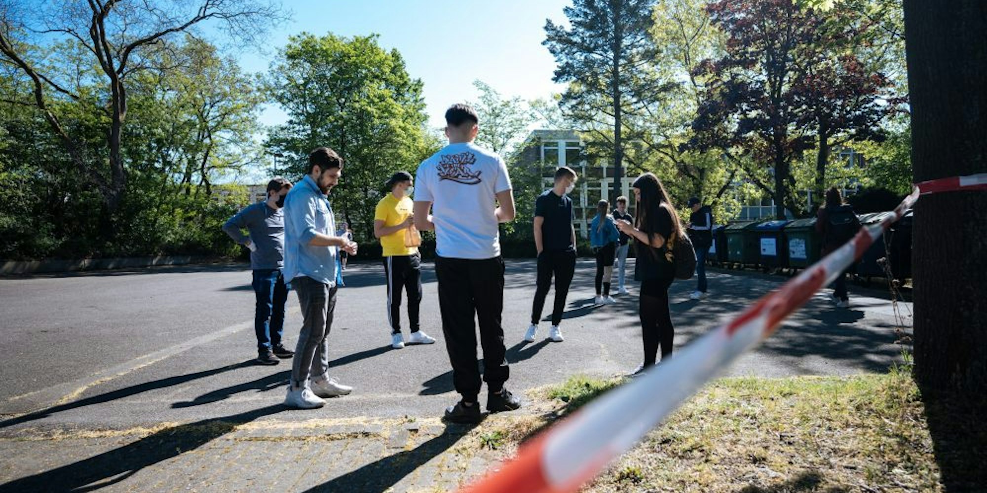 Köln – „Schön, dass Sie wieder da sind!“, steht auf einem Schild am Eingang des Erich-Gutenberg-Kollegs. Der erste Schultag nach dem Zwangsstopp wegen der Corona-Pandemie fühlt sich jedoch an der eigentlich vertrauten Schule „irgendwie surreal an“, sagt ein Schüler mit gedämpfter Stimme. „Wie im falschen Film.“ Jugendliche begegnen sich auf Distanz statt mit fröhlicher Umarmung, Ellbogen-Check und Wuhan-Begrüßung, mit Füßen. Freunde stehen auf getrennten Pausenhöfen an rot-weißen Flatterbändern wie an einer geschlossenen Grenze, findet Politiklehrerin Alexandra Ehlers, die gerade Aufsicht hat. „Die Schule ist ja ein Ort der Begegnung, mit warmherzigen Menschen.“ Zwei Meter Abstand halten, das fällt dabei vielen schwer.