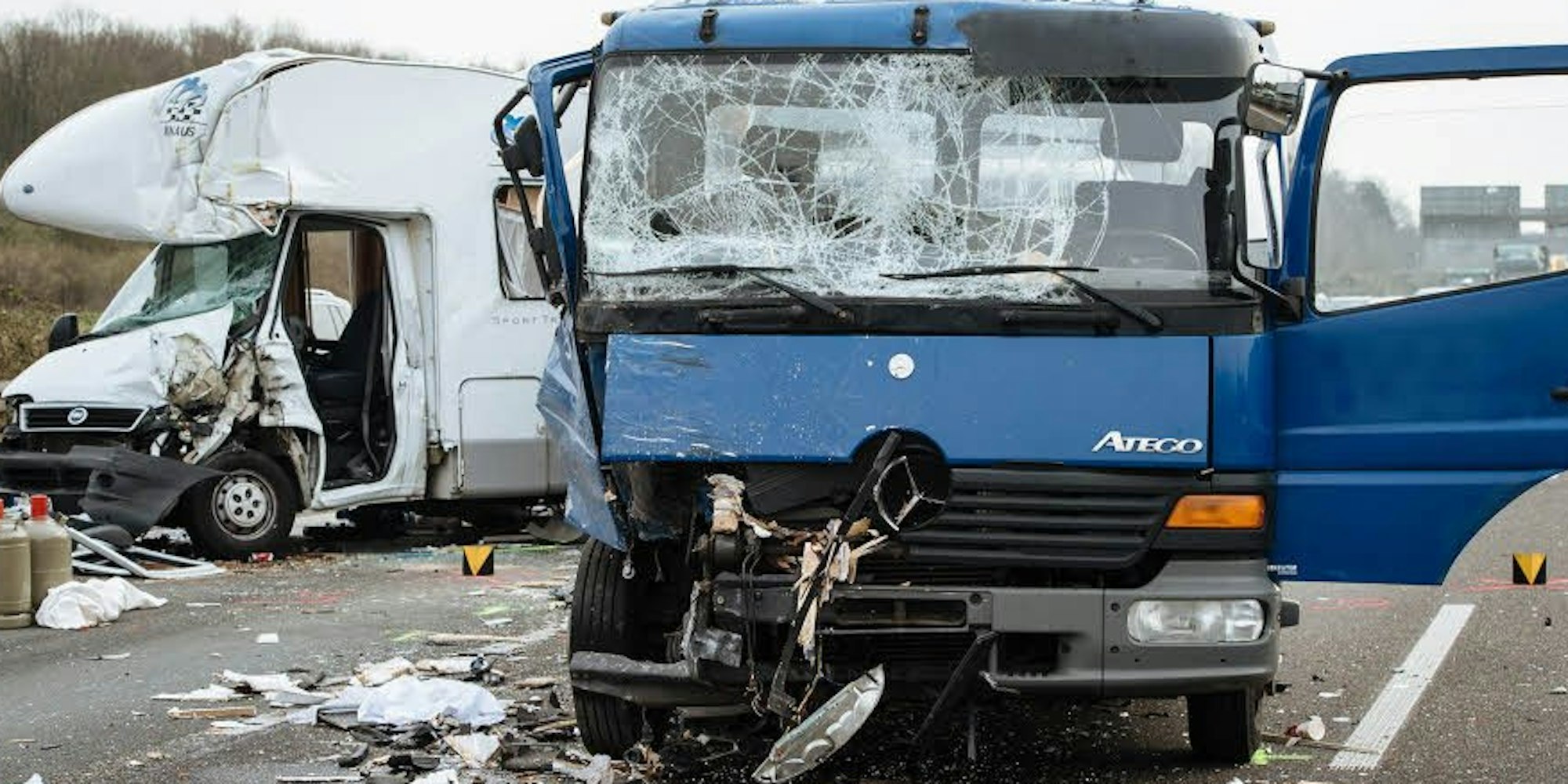 Ende eines Urlaubs: Auf der A3 bei Leverkusen war am Dienstag ein Autotransporter in ein Wohnmobil gerast, der Fahrer hatte laut Polizei ein Stauende übersehen.