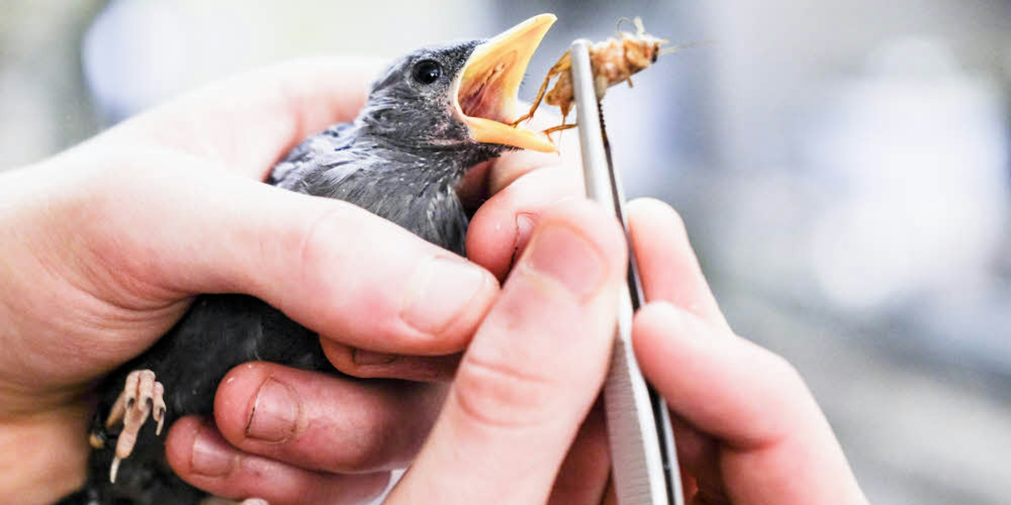 Köln – Fünf Heimchen und ein paar Blaubeeren – so viel verputzt der kleine Finkenschnabelstar auf einmal. Vor zweieinhalb Wochen ist er geschlüpft, im Moment wird er hinter den Kulissen des Tropenhauses im Kölner Zoo aufgezogen. Tierpfleger-Azubi Franklin Wilhelm reicht die Insekten und Beeren mit der Pinzette an. Bald wird der eigentlich aus Südostasien stammende Singvogel gemeinsam mit den anderen im Schaubereich zu sehen und zu hören sein – „sobald er futterfest ist und richtig fliegen kann“, erklärt Zookurator Bernd Marcordes.