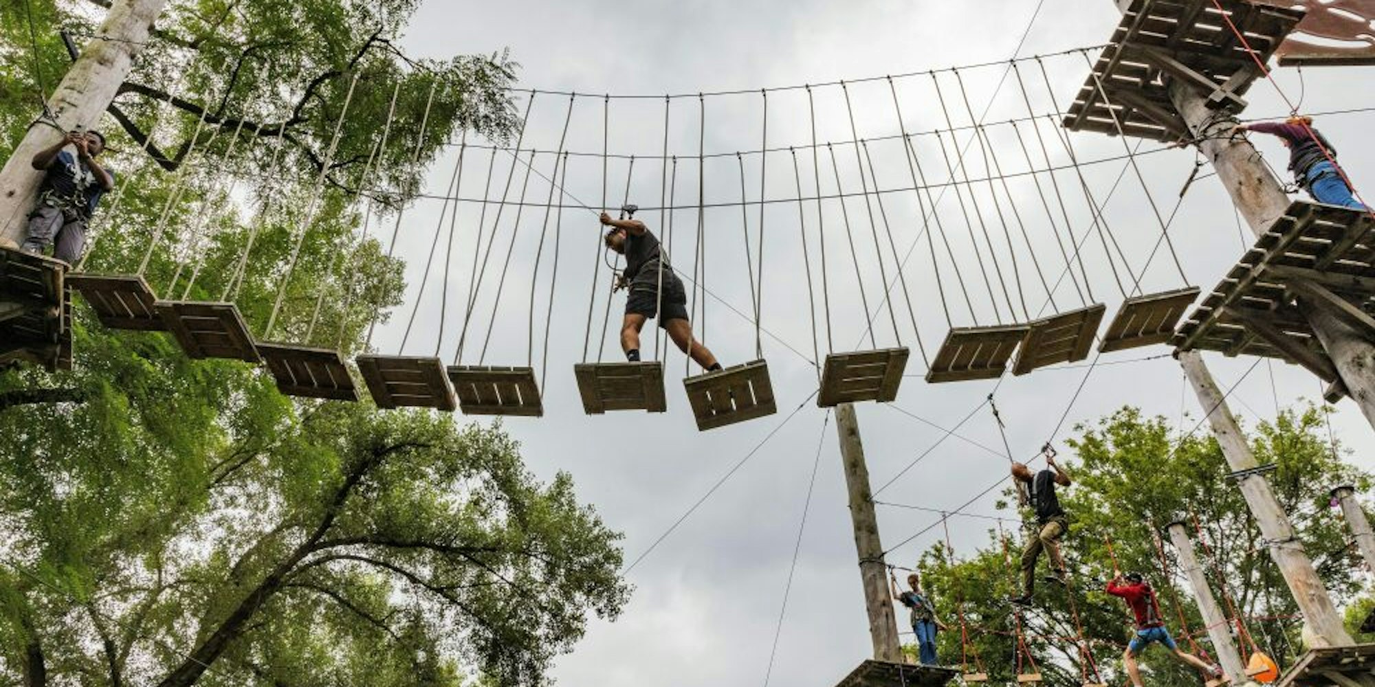 Am Blackfoot Beach am Fühlinger See können Schwindelfreie auf sieben verschiedenen Routen durch die Höhe spazieren. Gesichert geht es bis auf 20 Meter hoch und am Ende mit einer Rutschpartie über den See zurück.