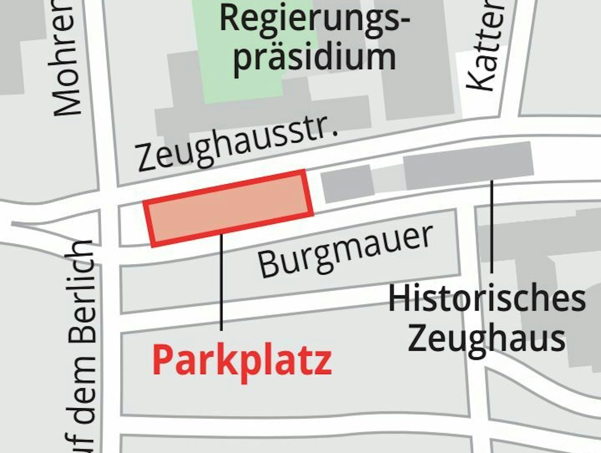 Köln – Vor 2000 Jahren endete hier das römische Köln. Ein imposanter Rest der römischen Stadtmauer zeugt bis heute von der großen Vergangenheit der Stadt. Doch was anderswo als Touristenattraktion inszeniert würde, dient in Köln lediglich als Abstellfläche für rund 50 Autos. Die Rede ist von dem Areal am Zeughaus zwischen Zeughausstraße, Burgmauer, Auf dem Berlich und der Alten Wache (siehe Grafik).