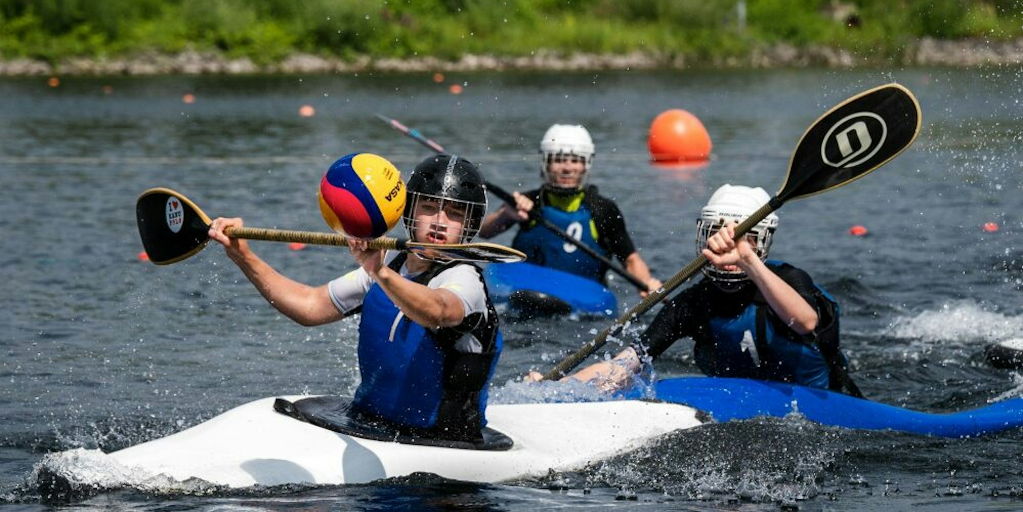 Beim Kanupolo wird Helm getragen, rammen und rempeln sind erlaubt.