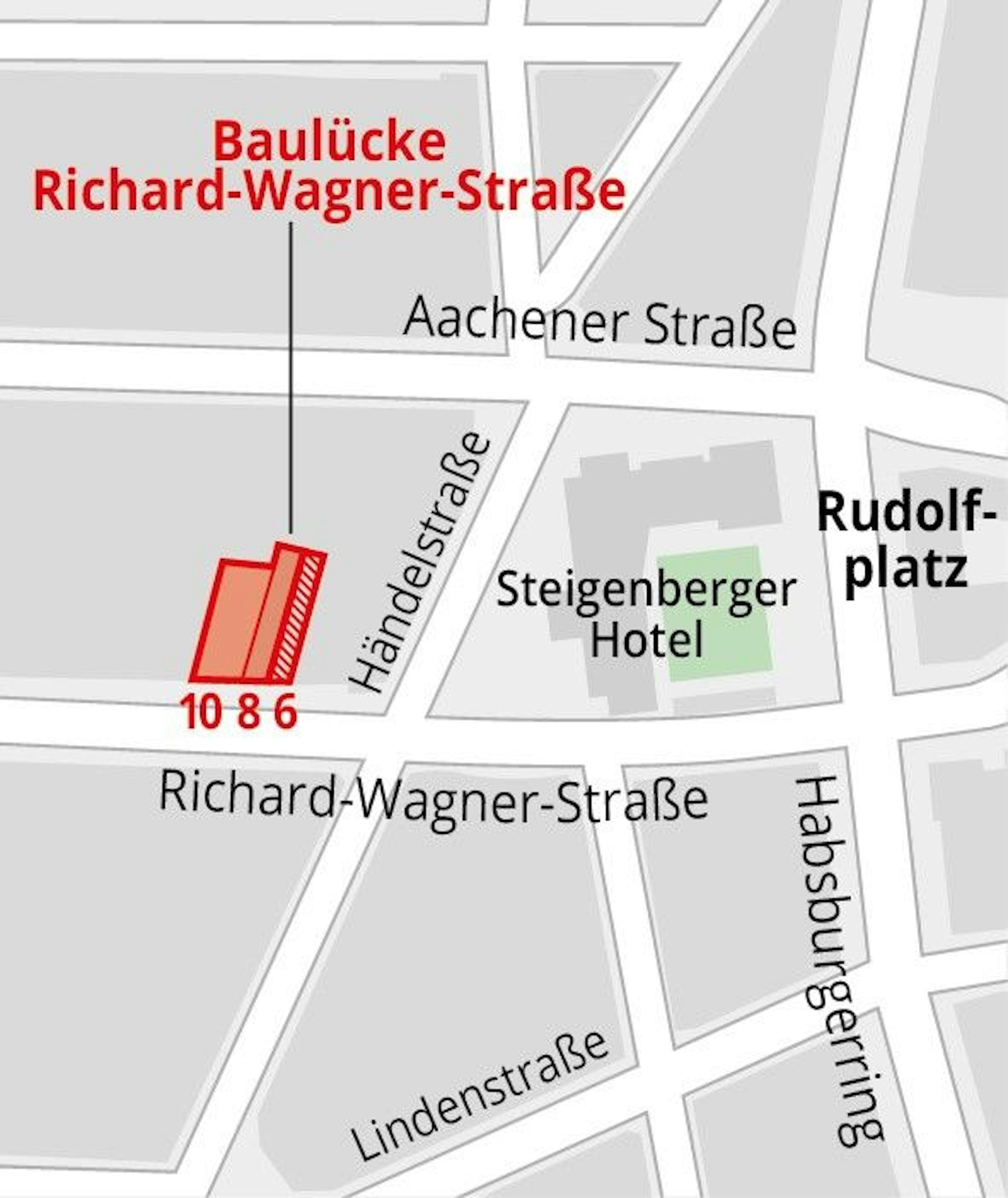 Die Grafik zeigt die Lage der Baulücke an der Richard-Wagner-Straße 6 bis 10 in Köln.