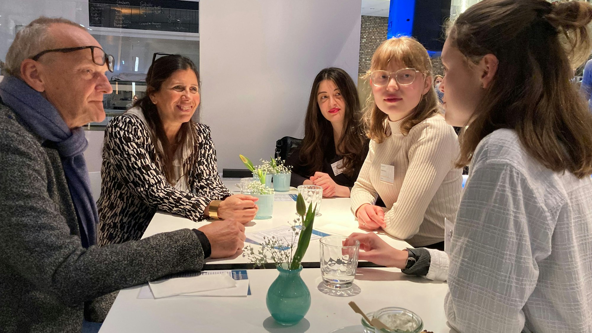 Die Förderer Ahuti Alice und Volkmar Müller und ihre Stipendiatinnen im Gespräch.