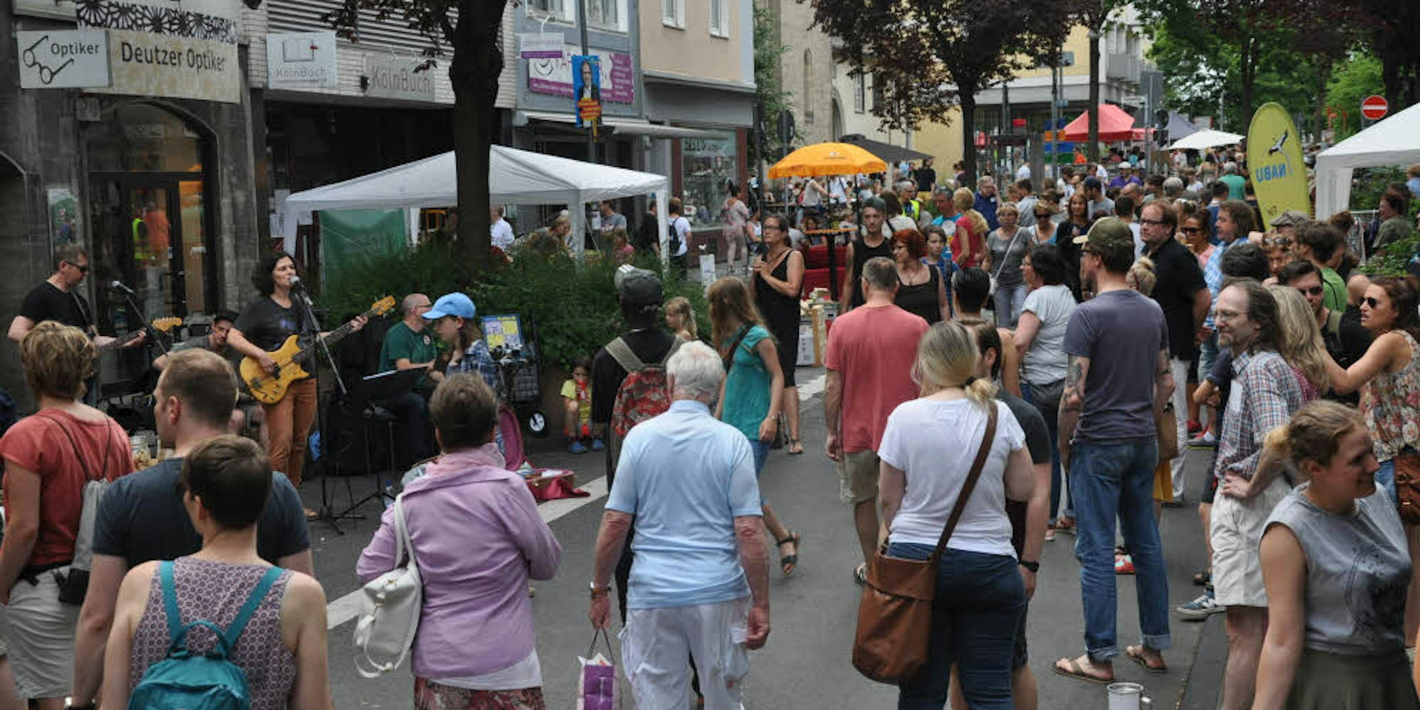 Ein Bummel ohne Autoverkehr – viele nutzen diese Gelegenheit in Deutz beim „Tag des guten Lebens“.