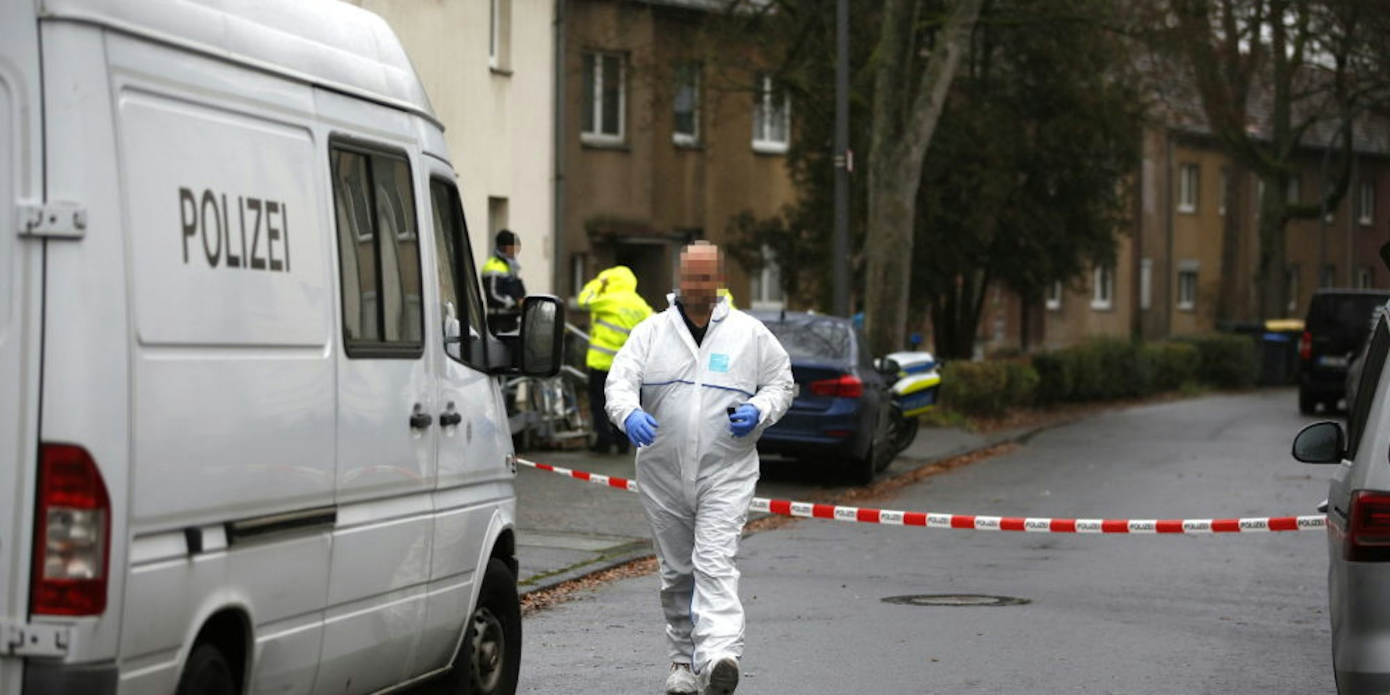 Die Spurensicherung untersucht den Tatort in der Straße „Auf der Schildwache“ in Dünnwald.