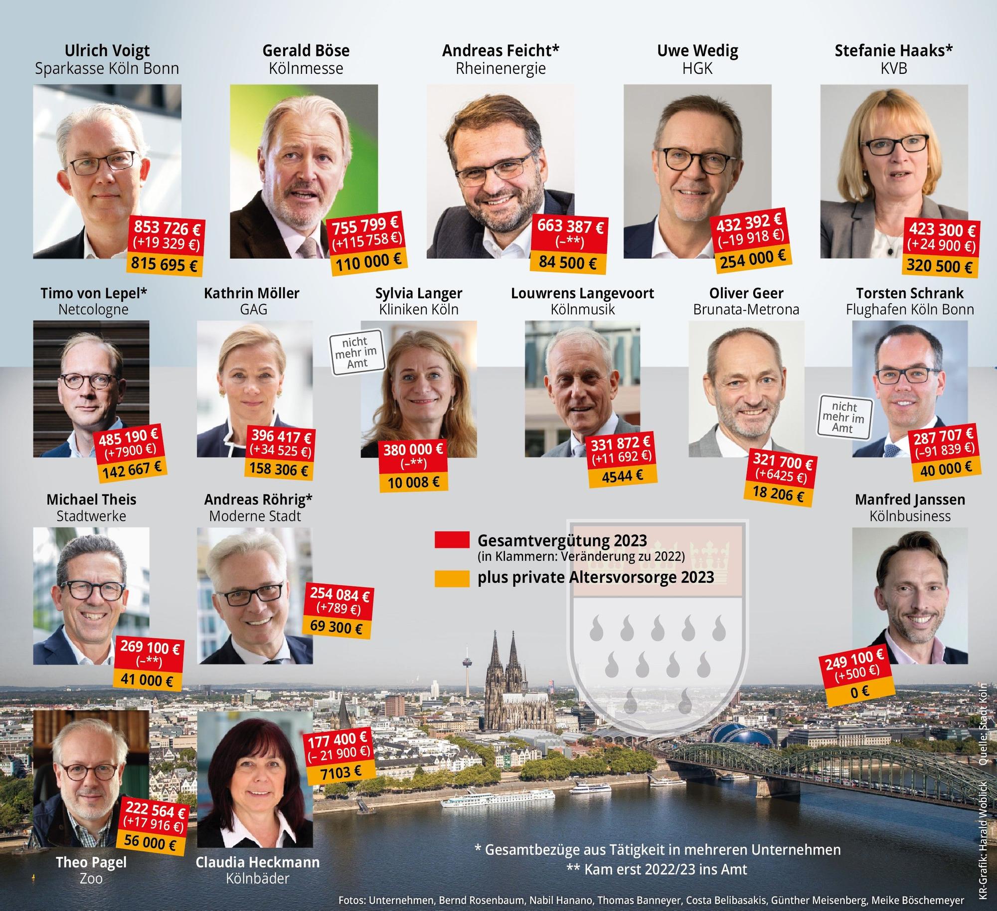 Auf Platz zwei folgt Messe-Chef Gerald Böse, der sich über ein sattes Gehaltsplus von 115.758 Euro freuen konnte und insgesamt 865.799 Euro einstrich. Platz drei der Top-Verdiener sicherte sich Rainer Virnich, Vorstandsmitglied der Sparkasse, mit Bezügen von insgesamt 799.003 Euro. Andreas Feicht, der seit 1. August 2022 Chef des Versorgers Rheinenergie sowie der Stadtwerke Köln ist, kam auf Bezüge von insgesamt 747.887 Euro. Ein üppiges Salär erhielten auch Uwe Wedig, Vorstandschef des Logistikkonzerns HGK(686.392 Euro Gesamtbezüge), sowie Messe-Geschäftsführer Oliver Frese (501.973 Euro Gehalt plus 59.252 Euro Privatrente).