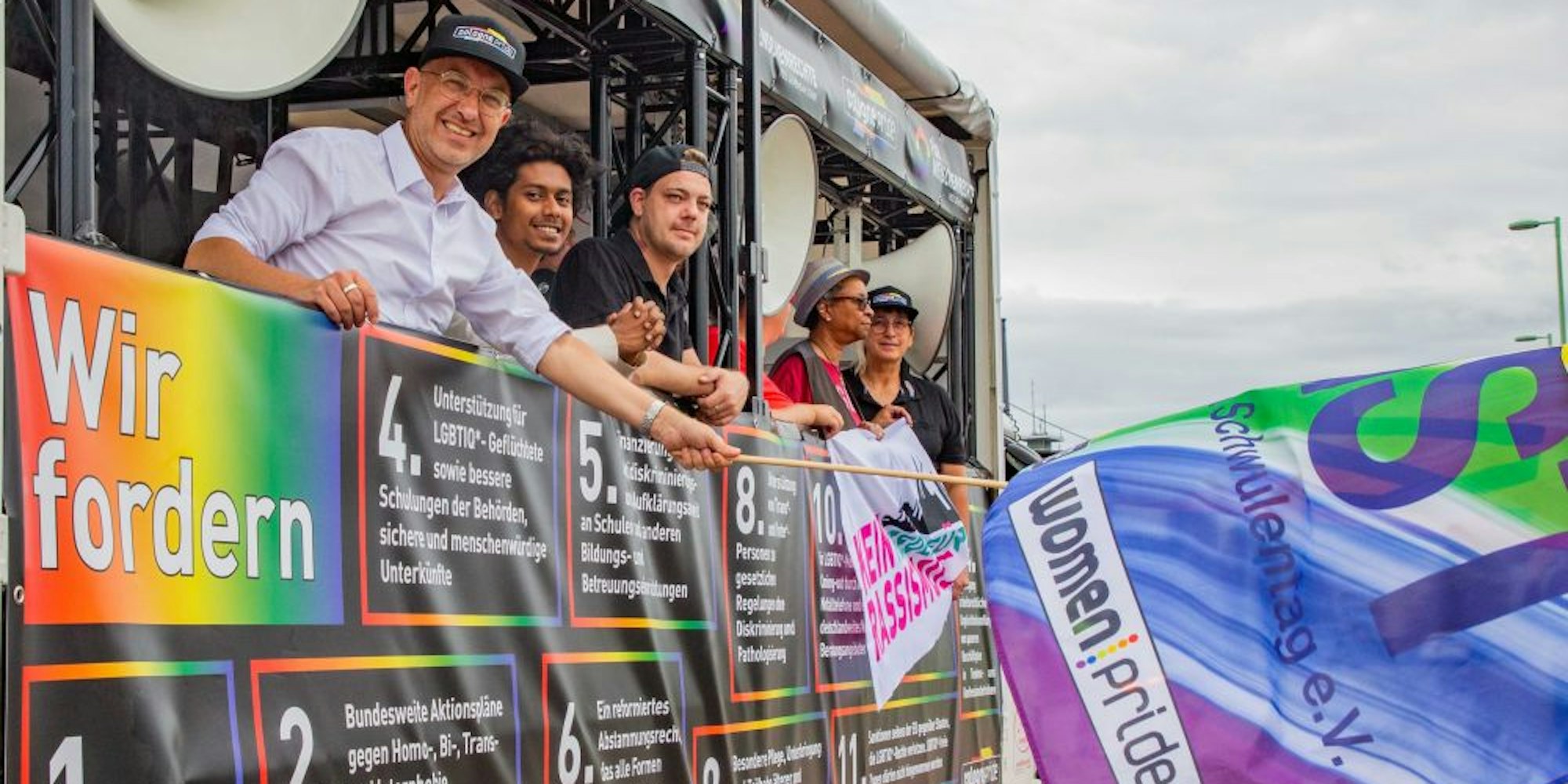 Auf dem Geister-Truck prangen die 14 politischen Forderungen der Interessensvertretung. An erster Stelle steht die Erweiterung des Grundgesetz-Artikels 3 um die Merkmale sexuelle und geschlechtliche Identität. An die EU appelliert die Community, Sanktionen gegen Staaten zu verhängen, die homosexuelle und geschlechtlich diverse Menschen diskriminieren.