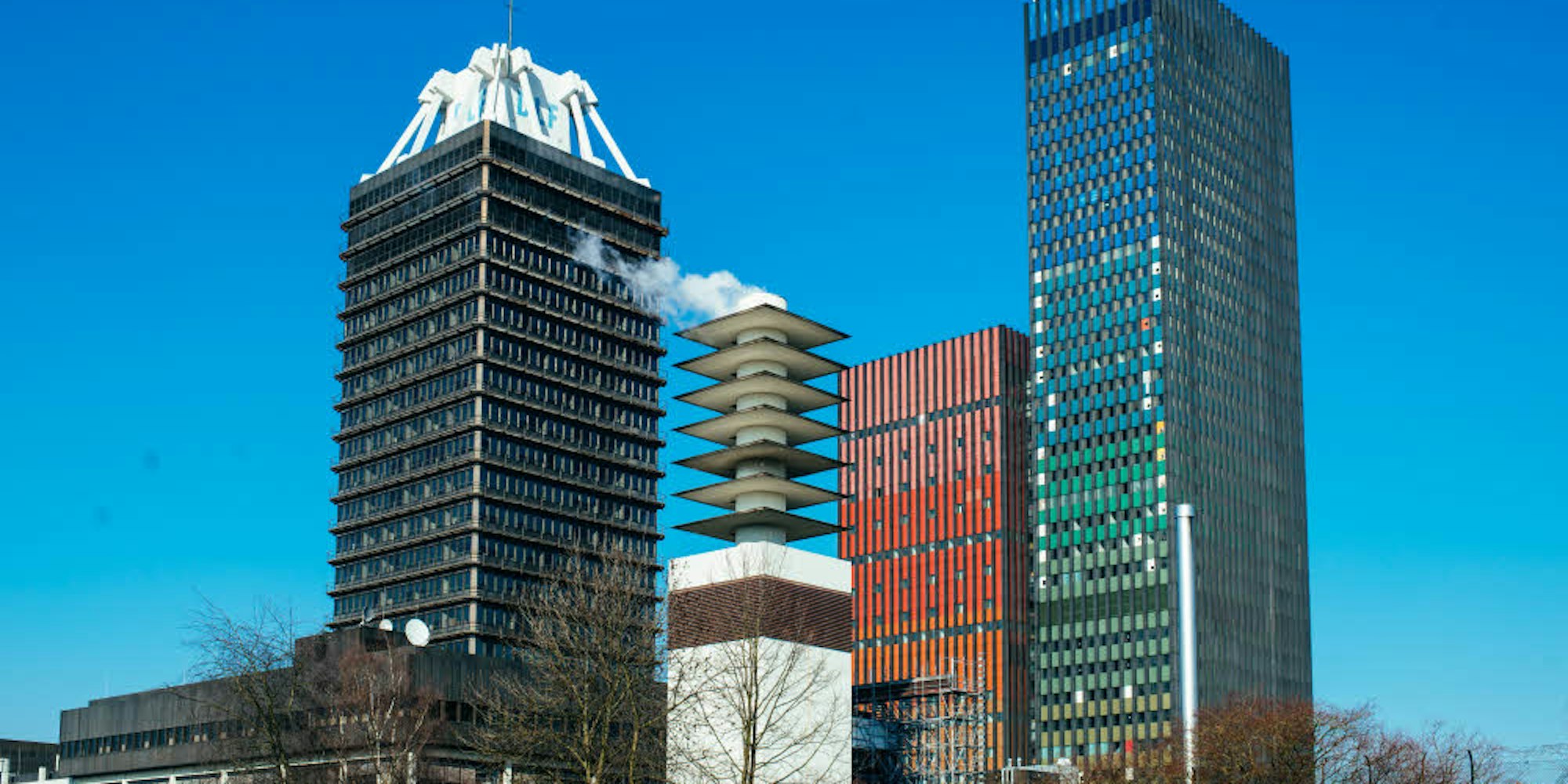 Nachbarn auf Zeit: Der Turm des Deutschlandfunks mit den Buchstaben DLF auf dem Dach (links) steht nur 35 Meter entfernt vom früheren Studioturm (orange), dem Aufzugturm (verdeckt) und dem Büroturm (blau/grün) der Deutschen Welle.