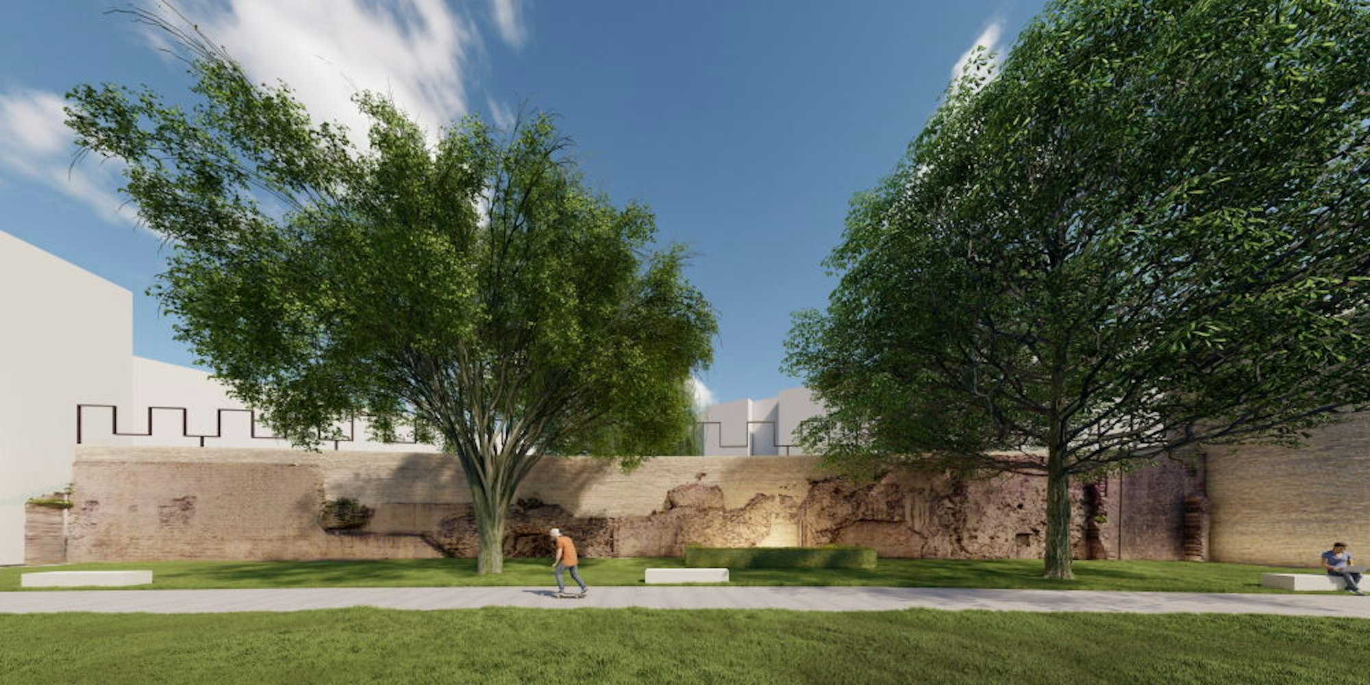 Ein Entwurf des Architekturbüros Kaspar Kraemer zeigt, wie das mal aussehen könnte (siehe Visualisierung). Dabei sollen sich die Originalmauerreste einerseits in das Gesamtbild der Stadtmauerrekonstruktion einfügen. Andererseits sollen sie aber auch in Zukunft mit ihren Beschädigungen eindeutig als historische Substanz zu erkennen sein.