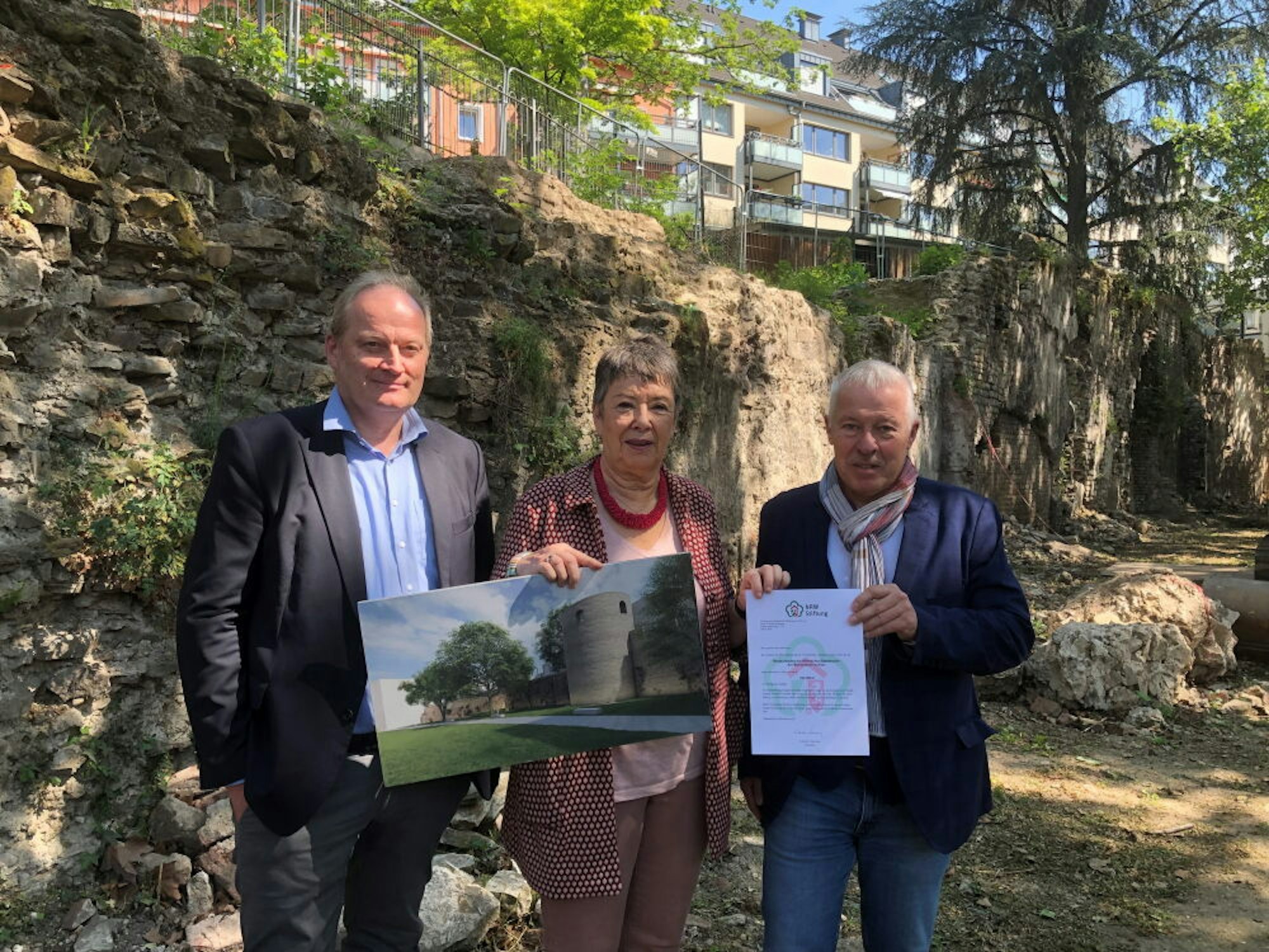 Karl-Heinz Erdmann von der NRW-Stiftung (r.) mit Barbara Schock-Werner und Marcus Trier (l.) vor der Römermauer.