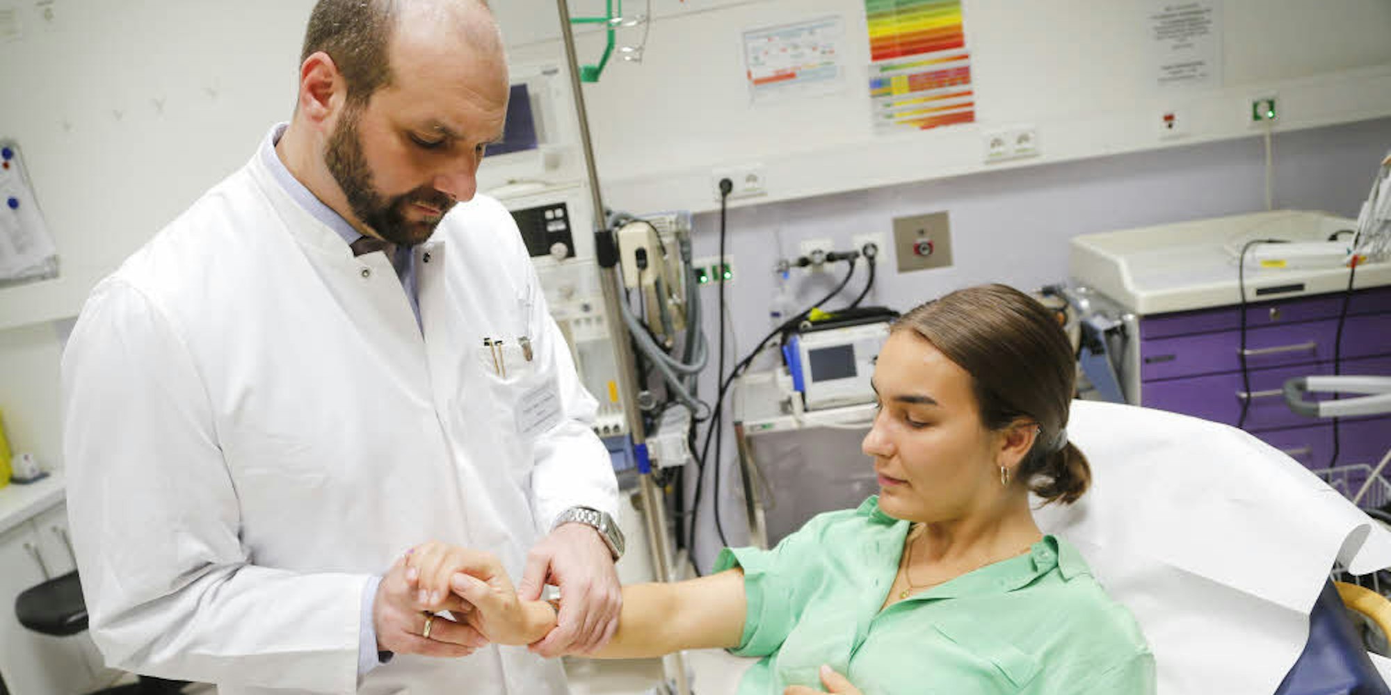Abtasten: Chefarzt Dr. Emmanouil Skouras zeigt bei einem Pressetermin die typischen Verletzungsstellen.