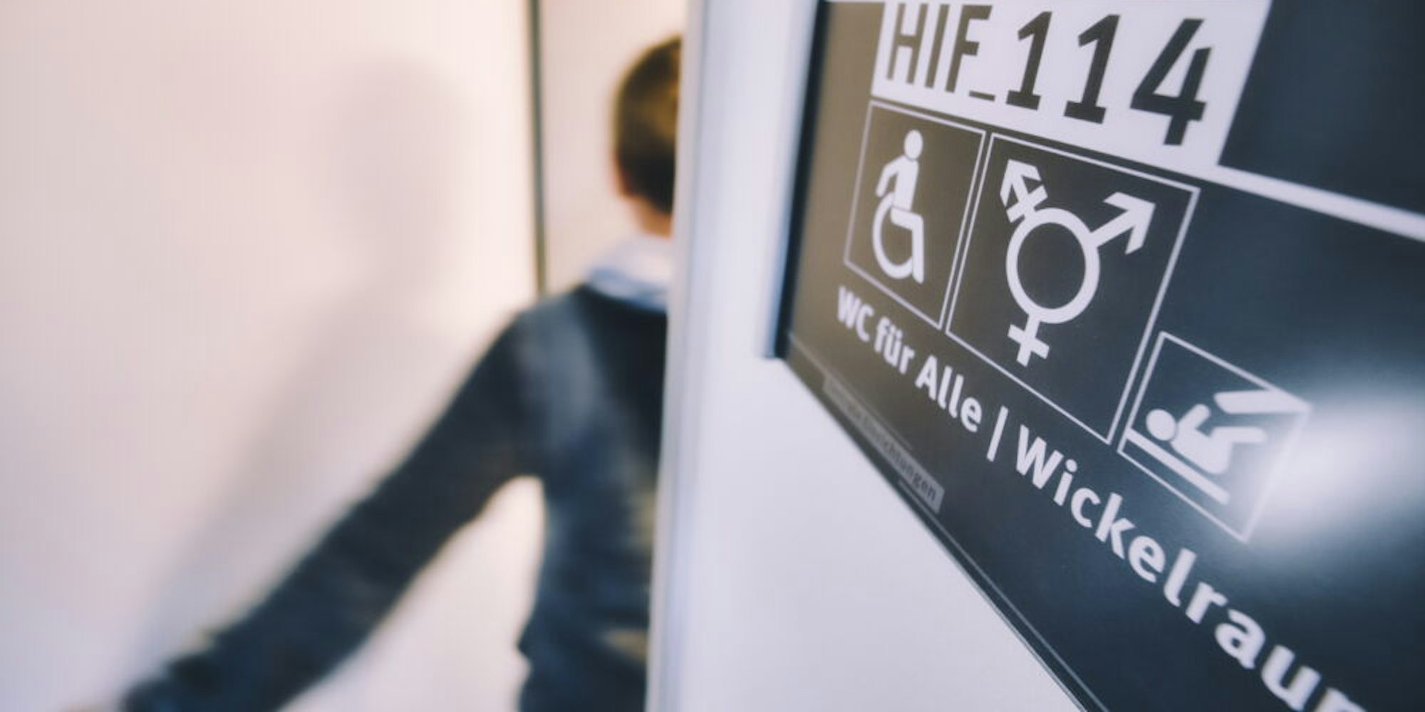 Das Transgenderzeichen steht auf einem Schild vor einem „WC für Alle“ an einer Hochschule.