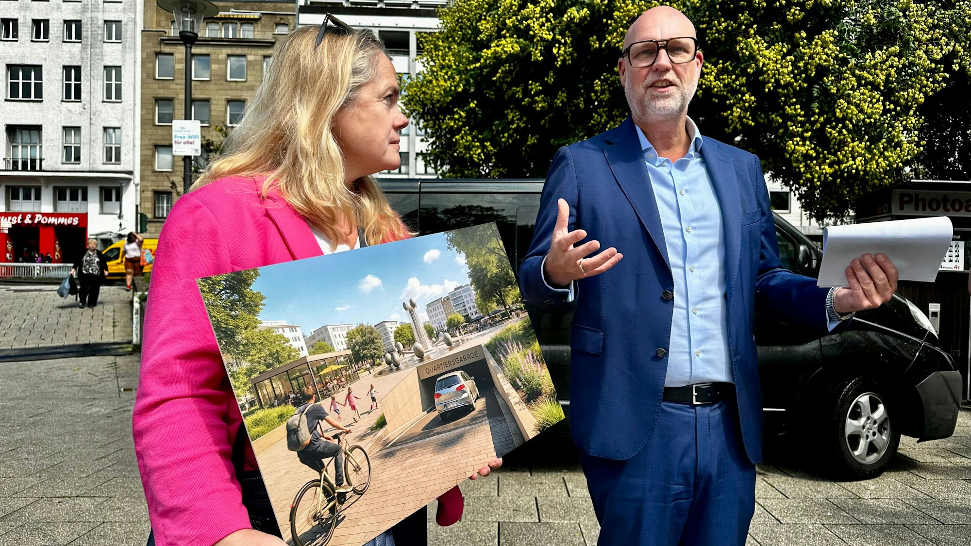 Stefanie Ruffen und Volker Görzel (FDP) mit ihrer Animation für eine Quartiersgarage am Ebertplatz