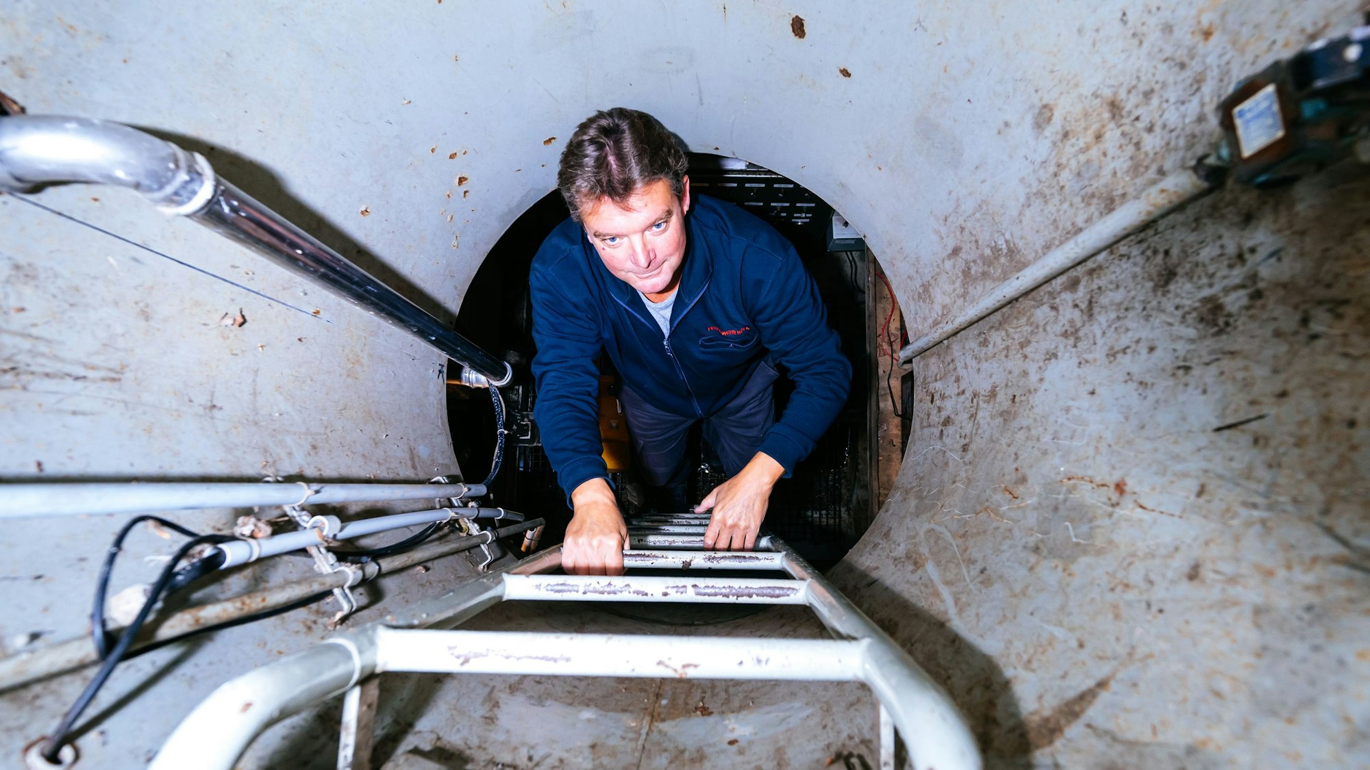 Guido Rahm vom Warndienst der Feuerwehr Köln klettert in den Technikbunker einer Pressluftsirene.